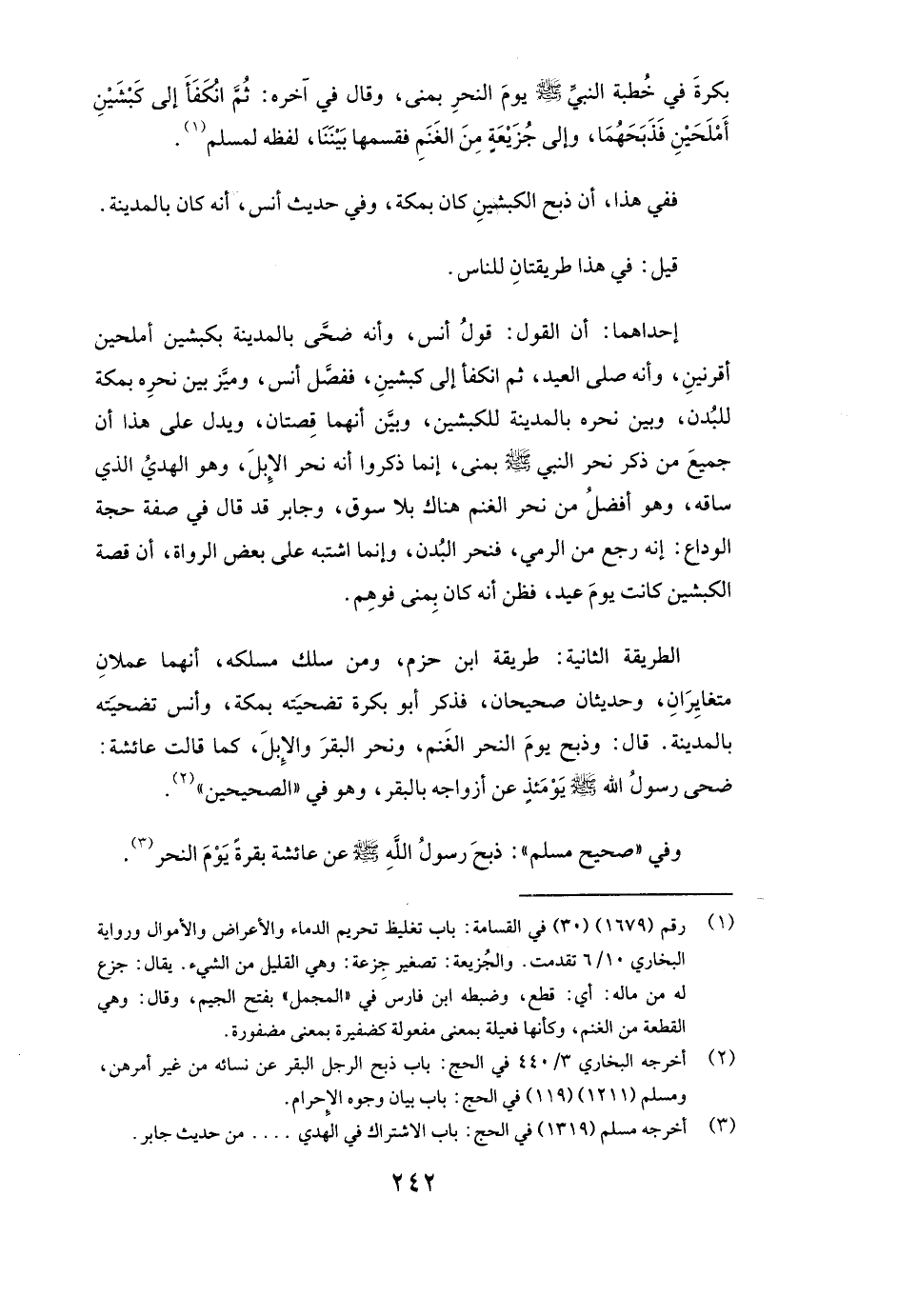 إِحْدَاهُمَا: أَنَّ الْقَوْلَ: قَوْلُ أنس، وَأَنَّهُ ضَحَّى بِالْمَدِينَةِ بِكَبْشَيْنِ أَمْلَحَيْنِ أَقْرَنَيْنِ، وَأَنَّهُ صَلَّى الْعِيدَ ثُمَّ انْكَفَأَ إِلَى كَبْشَيْنِ، فَفَصَّلَ أنس، وَمَيَّزَ بَيْنَ نَحْرِهِ بِمَكَّةَ لِلْبُدْنِ، وَبَيْنَ نَحْرِهِ بِالْمَدِينَةِ لِلْكَبْشَيْنِ، وَبَيَّنَ إِنَّهُمَا قِصَّتَانِ، وَيَدُلُّ عَلَى هَذَا أَنَّ جَمِيعَ مَنْ ذَكَرَ نَحْرَ النَّبِيِّ - صَلَّى اللَّهُ عَلَيْهِ وَسَلَّمَ - بِمِنًى، إِنَّمَا ذَكَرُوا أَنَّهُ نَحَرَ الْإِبِلَ، وَهُوَ الْهَدْيُ الَّذِي سَاقَهُ، وَهُوَ أَفْضَلُ مِنْ نَحْرِ الْغَنَمِ هُنَاكَ بِلَا سَوْقٍ، وجابر قَدْ قَالَ فِي صِفَةِ حَجَّةِ الْوَدَاعِ: إِنَّهُ رَجَعَ مِنَ الرَّمْيِ، فَنَحَرَ الْبُدْنَ، وَإِنَّمَا اشْتَبَهَ عَلَى بَعْضِ الرُّوَاةِ، أَنَّ قِصَّةَ الْكَبْشَيْنِ كَانَتْ يَوْمَ عِيدٍ، فَظَنَّ أَنَّهُ كَانَ بِمِنًى فَوَهِمَ.