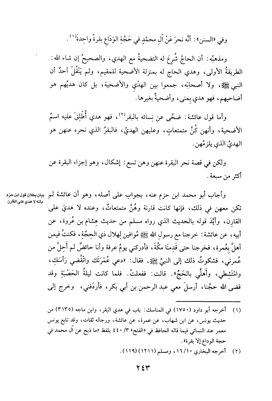 وَأَجَابَ أبو محمد ابن حزم عَنْهُ بِجَوَابٍ عَلَى أَصْلِهِ، وَهُوَ أَنَّ عائشة لَمْ تَكُنْ مَعَهُنَّ فِي ذَلِكَ، فَإِنَّهَا كَانَتْ قَارِنَةً وَهُنَّ مُتَمَتِّعَاتٌ، وَعِنْدَهُ لَا هَدْيَ عَلَى الْقَارِنِ، وَأَيَّدَ قَوْلَهُ بِالْحَدِيثِ الَّذِي رَوَاهُ مسلم مِنْ حَدِيثِ هِشَامِ بْنِ عُرْوَةَ، عَنْ أَبِيهِ، عَنْ عائشة: خَرَجْنَا مَعَ رَسُولِ اللَّهِ - صَلَّى اللَّهُ عَلَيْهِ وَسَلَّمَ - مُوَافِينَ لِهِلَالِ ذِي الْحِجَّةِ، فَكُنْتُ فِيمَنْ أَهَلَّ بِعُمْرَةٍ، فَخَرَجْنَا حَتَّى قَدِمْنَا مَكَّةَ، فَأَدْرَكَنِي يَوْمُ عَرَفَةَ وَأَنَا حَائِضٌ لَمْ أَحِلَّ مِنْ عُمْرَتِي، فَشَكَوْتُ ذَلِكَ إِلَى النَّبِيِّ - صَلَّى اللَّهُ عَلَيْهِ وَسَلَّمَ -، فَقَالَ: " «دَعِي عُمْرَتَكِ وَانْقُضِي رَأْسَكِ، وَامْتَشِطِي، وَأَهِلِّي بِالْحَجِّ» ". قَالَتْ: فَفَعَلْتُ. فَلَمَّا كَانَتْ لَيْلَةُ الْحَصْبَةِ وَقَدْ قَضَى اللَّهُ حَجَّنَا، أَرْسَلَ مَعِيَ عَبْدَ الرَّحْمَنِ بْنَ أَبِي بَكْرٍ، فَأَرْدَفَنِي، وَخَرَجَ إِلَى