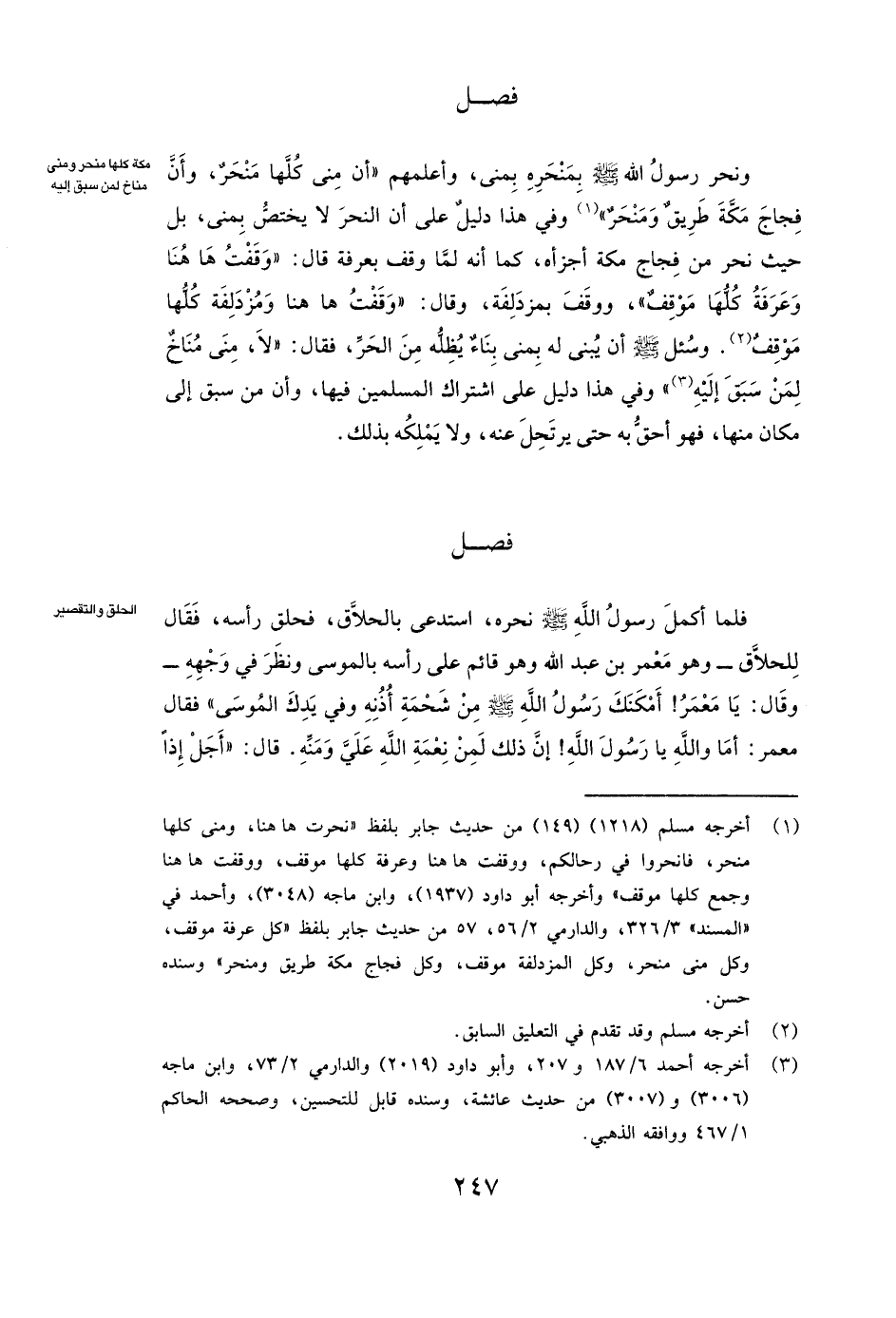 وَنَحَرَ رَسُولُ اللَّهِ - صَلَّى اللَّهُ عَلَيْهِ وَسَلَّمَ - بِمَنْحَرِهِ بِمِنًى، وَأَعْلَمَهُمْ " أَنَّ مِنًى كُلَّهَا مَنْحَرٌ، وَأَنَّ فِجَاجَ مَكَّةَ طَرِيقٌ وَمَنْحَرٌ "، وَفِي هَذَا دَلِيلٌ عَلَى أَنَّ النَّحْرَ لَا يَخْتَصُّ بِمِنًى، بَلْ حَيْثُ نَحَرَ مِنْ فِجَاجِ مَكَّةَ أَجْزَأَهُ، كَمَا أَنَّهُ لَمَّا وَقَفَ بِعَرَفَةَ، قَالَ: " «وَقَفْتُ هَاهُنَا وَعَرَفَةُ كُلُّهَا مَوْقِفٌ» " وَوَقَفَ بِمُزْدَلِفَةَ، وَقَالَ: " «وَقَفْتُ هَاهُنَا، وَمُزْدَلِفَةُ كُلُّهَا مَوْقِفٌ» «وَسُئِلَ - صَلَّى اللَّهُ عَلَيْهِ وَسَلَّمَ - أَنْ يُبْنَى لَهُ بِمِنًى بِنَاءٌ يُظِلُّهُ مِنَ الْحَرِّ فَقَالَ: لَا، مِنًى مُنَاخٌ لِمَنْ سَبَقَ إِلَيْهِ» " وَفِي هَذَا دَلِيلٌ عَلَى اشْتِرَاكِ الْمُسْلِمِينَ فِيهَا، وَأَنَّ مَنْ سَبَقَ إِلَى مَكَانٍ مِنْهَا، فَهُوَ أَحَقُّ بِهِ حَتَّى يَرْتَحِلَ عَنْهُ وَلَا يَمْلِكُهُ بِذَلِكَ.