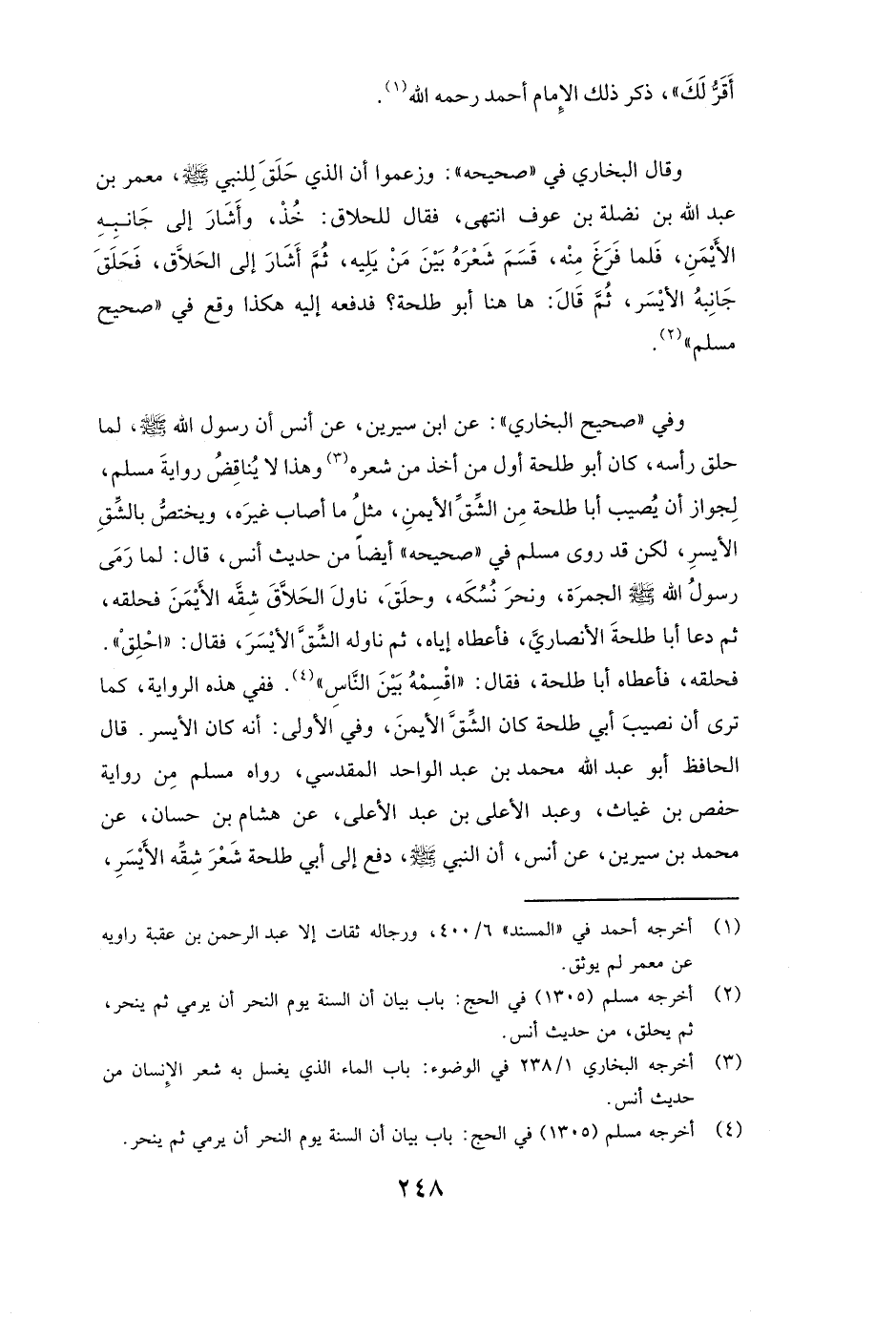 وَفِي " صَحِيحِ الْبُخَارِيِّ ": عَنِ ابْنِ سِيرِينَ، عَنْ أنس أَنَّ «رَسُولَ اللَّهِ - صَلَّى اللَّهُ عَلَيْهِ وَسَلَّمَ - لَمَّا حَلَقَ رَأْسَهُ كَانَ أبو طلحة أَوَّلَ مَنْ أَخَذَ مِنْ شَعْرِهِ» ، وَهَذَا لَا يُنَاقِضُ رِوَايَةَ مسلم، لِجِوَازِ أَنْ يُصِيبَ أبا طلحة مِنَ الشِّقِّ الْأَيْمَنِ مِثْلُ مَا أَصَابَ غَيْرَهُ، وَيَخْتَصُّ بِالشِّقِّ الْأَيْسَرِ، لَكِنْ قَدْ رَوَى مسلم فِي " صَحِيحِهِ " أَيْضًا مِنْ حَدِيثِ أنس، قَالَ: «لَمَّا رَمَى رَسُولُ اللَّهِ - صَلَّى اللَّهُ عَلَيْهِ وَسَلَّمَ - الْجَمْرَةَ وَنَحَرَ نُسُكَهُ وَحَلَقَ نَاوَلَ الْحَلَّاقَ شِقَّهُ الْأَيْمَنَ فَحَلَقَهُ ثُمَّ دَعَا أَبَا طَلْحَةَ الْأَنْصَارِيَّ، فَأَعْطَاهُ إِيَّاهُ ثُمَّ نَاوَلَهُ الشِّقَّ الْأَيْسَرَ فَقَالَ: احْلِقْ. فَحَلَقَهُ فَأَعْطَاهُ أبا طلحة، فَقَالَ اقْسِمْهُ بَيْنَ النَّاسِ» . فَفِي هَذِهِ الرِّوَايَةِ كَمَا تَرَى أَنَّ نَصِيبَ أبي طلحة كَانَ الشِّقَّ الْأَيْمَنَ، وَفِي الْأُولَى: أَنَّهُ كَانَ الْأَيْسَرَ. قَالَ الْحَافِظُ أبو عبد الله محمد بن عبد الواحد المقدسي، رَوَاهُ مسلم مِنْ رِوَايَةِ حَفْصِ بْنِ غِيَاثٍ، وَعَبْدُ الْأَعْلَى بْنُ عَبْدِ الْأَعْلَى، عَنْ هِشَامِ بْنِ حَسَّانَ، عَنْ مُحَمِّدِ بْنِ سِيرِينَ، عَنْ أنس، أَنَّ النَّبِيَّ - صَلَّى اللَّهُ عَلَيْهِ وَسَلَّمَ - «دَفَعَ إِلَى أبي طلحة شَعْرَ شِقِّهِ الْأَيْسَرِ» ،
