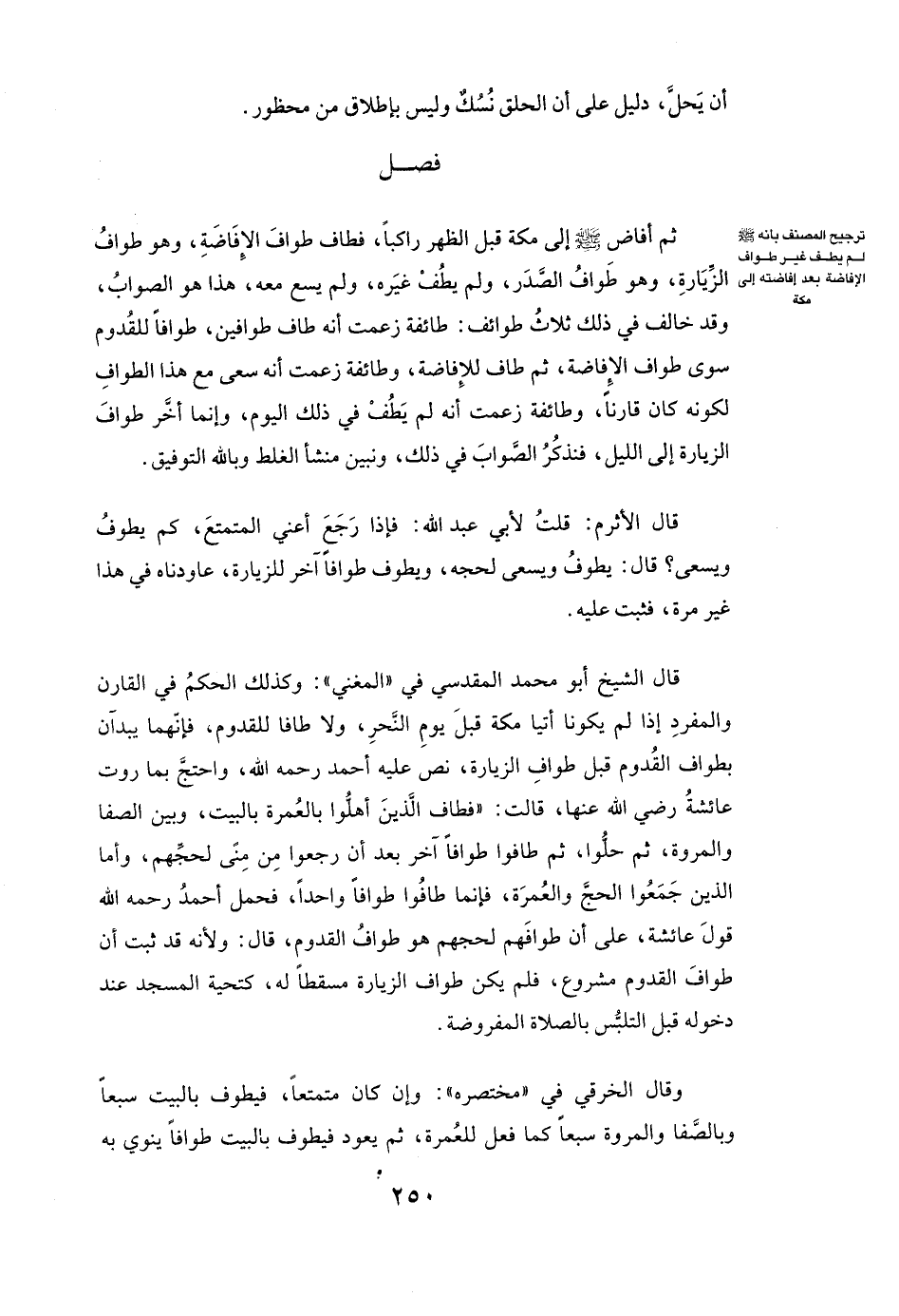 ثُمَّ أَفَاضَ - صَلَّى اللَّهُ عَلَيْهِ وَسَلَّمَ - إِلَى مَكَّةَ قَبْلَ الظُّهْرِ رَاكِبًا، فَطَافَ طَوَافَ الْإِفَاضَةِ وَهُوَ طَوَافُ الزِّيَارَةِ وَهُوَ طَوَافُ الصَّدَرِ، وَلَمْ يَطُفْ غَيْرَهُ، وَلَمْ يَسْعَ مَعَهُ هَذَا هُوَ الصَّوَابُ، وَقَدْ خَالَفَ فِي ذَلِكَ ثَلَاثُ طَوَائِفَ: طَائِفَةٌ زَعَمَتْ أَنَّهُ طَافَ طَوَافَيْنِ طَوَافًا لِلْقُدُومِ سِوَى طَوَافِ الْإِفَاضَةِ، ثُمَّ طَافَ لِلْإِفَاضَةِ، وَطَائِفَةٌ زَعَمَتْ أَنَّهُ سَعَى مَعَ هَذَا الطَّوَافِ لِكَوْنِهِ كَانَ قَارِنًا، وَطَائِفَةٌ زَعَمَتْ أَنَّهُ لَمْ يَطُفْ فِي ذَلِكَ الْيَوْمِ، وَإِنَّمَا أَخَّرَ طَوَافَ الزِّيَارَةِ إِلَى اللَّيْلِ، فَنَذْكُرُ الصَّوَابَ فِي ذَلِكَ، وَنُبَيِّنُ مَنْشَأَ الْغَلَطِ وَبِاللَّهِ التَّوْفِيقُ.