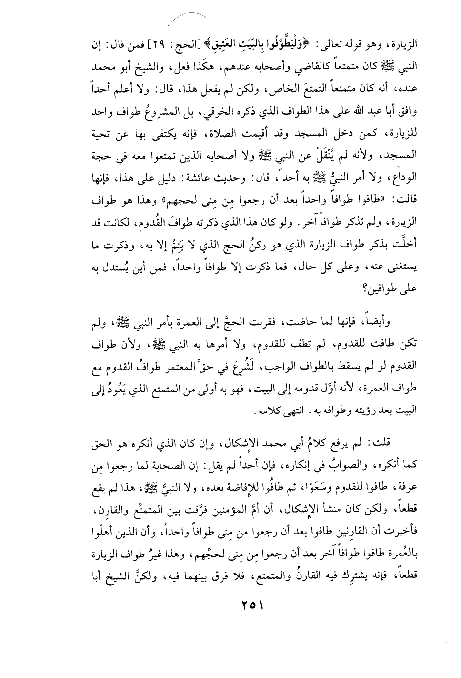 الزِّيَارَةَ وَهُوَ قَوْلُهُ تَعَالَى: {وَلْيَطَّوَّفُوا بِالْبَيْتِ الْعَتِيقِ} [الحج: 29] [الْحَجِّ: 29] فَمَنْ قَالَ: إِنَّ النَّبِيَّ - صَلَّى اللَّهُ عَلَيْهِ وَسَلَّمَ - كَانَ مُتَمَتِّعًا كَالْقَاضِي وَأَصْحَابِهِ عِنْدَهُمْ هَكَذَا فَعَلَ، وَالشَّيْخُ أبو محمد عِنْدَهُ أَنَّهُ كَانَ مُتَمَتِّعًا التَّمَتُّعَ الْخَاصَّ، وَلَكِنْ لَمْ يَفْعَلْ هَذَا، قَالَ: وَلَا أَعْلَمُ أَحَدًا وَافَقَ أبا عبد الله عَلَى هَذَا الطَّوَافِ الَّذِي ذَكَرَهُ الخرقي، بَلِ الْمَشْرُوعُ طَوَافٌ وَاحِدٌ لِلزِّيَارَةِ كَمَنْ دَخَلَ الْمَسْجِدَ، وَقَدْ أُقِيمَتِ الصَّلَاةُ فَإِنَّهُ يَكْتَفِي بِهَا عَنْ تَحِيَّةِ الْمَسْجِدِ، وَلِأَنَّهُ لَمْ يُنْقَلْ عَنِ النَّبِيِّ - صَلَّى اللَّهُ عَلَيْهِ وَسَلَّمَ - وَلَا أَصْحَابِهِ الَّذِينَ تَمَتَّعُوا مَعَهُ فِي حَجَّةِ الْوَدَاعِ، وَلَا أَمَرَ النَّبِيُّ - صَلَّى اللَّهُ عَلَيْهِ وَسَلَّمَ - بِهِ أَحَدًا، قَالَ: وَحَدِيثُ عائشة دَلِيلٌ عَلَى هَذَا، فَإِنَّهَا قَالَتْ: " طَافُوا طَوَافًا وَاحِدًا بَعْدَ أَنْ رَجَعُوا مِنْ مِنًى؛ لِحَجِّهِمْ " وَهَذَا هُوَ طَوَافُ الزِّيَارَةِ وَلَمْ تَذْكُرْ طَوَافًا آخَرَ. وَلَوْ كَانَ هَذَا الَّذِي ذَكَرَتْهُ طَوَافَ الْقُدُومِ، لَكَانَتْ قَدْ أَخَلَّتْ بِذِكْرِ طَوَافِ الزِّيَارَةِ الَّذِي هُوَ رُكْنُ الْحَجِّ الَّذِي لَا يَتِمُّ إِلَّا بِهِ، وَذَكَرَتْ مَا يُسْتَغْنَى عَنْهُ، وَعَلَى كُلِّ حَالٍ فَمَا ذَكَرَتْ إِلَّا طَوَافًا وَاحِدًا، فَمِنْ أَيْنَ يُسْتَدَلُّ بِهِ عَلَى طَوَافَيْنِ؟