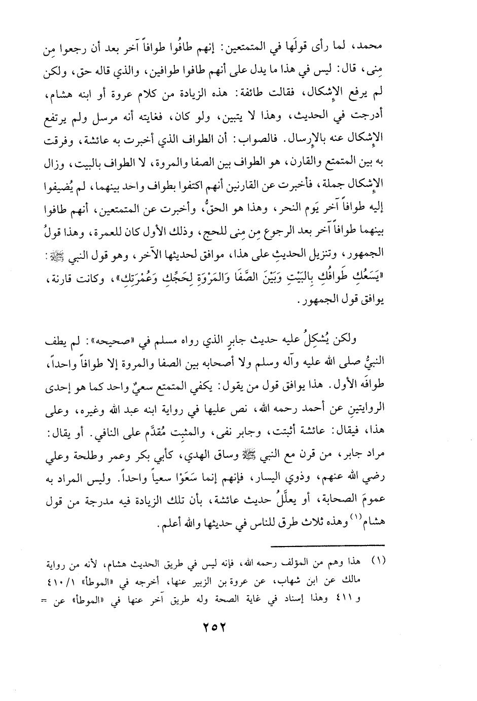 محمد، لَمَّا رَأَى قَوْلَهَا فِي الْمُتَمَتِّعِينَ: إِنَّهُمْ طَافُوا طَوَافًا آخَرَ بَعْدَ أَنْ رَجَعُوا مِنْ مِنًى، قَالَ: لَيْسَ فِي هَذَا مَا يَدُلُّ عَلَى أَنَّهُمْ طَافُوا طَوَافَيْنِ وَالَّذِي قَالَهُ حَقٌّ، وَلَكِنْ لَمْ يَرْفَعِ الْإِشْكَالَ فَقَالَتْ طَائِفَةٌ هَذِهِ الزِّيَادَةُ مِنْ كَلَامِ عروة، أَوِ ابْنِهِ هشام، أُدْرِجَتْ فِي الْحَدِيثِ، وَهَذَا لَا يَتَبَيَّنُ، وَلَوْ كَانَ فَغَايَتُهُ أَنَّهُ مُرْسَلٌ وَلَمْ يَرْتَفِعِ الْإِشْكَالُ عَنْهُ بِالْإِرْسَالِ.
