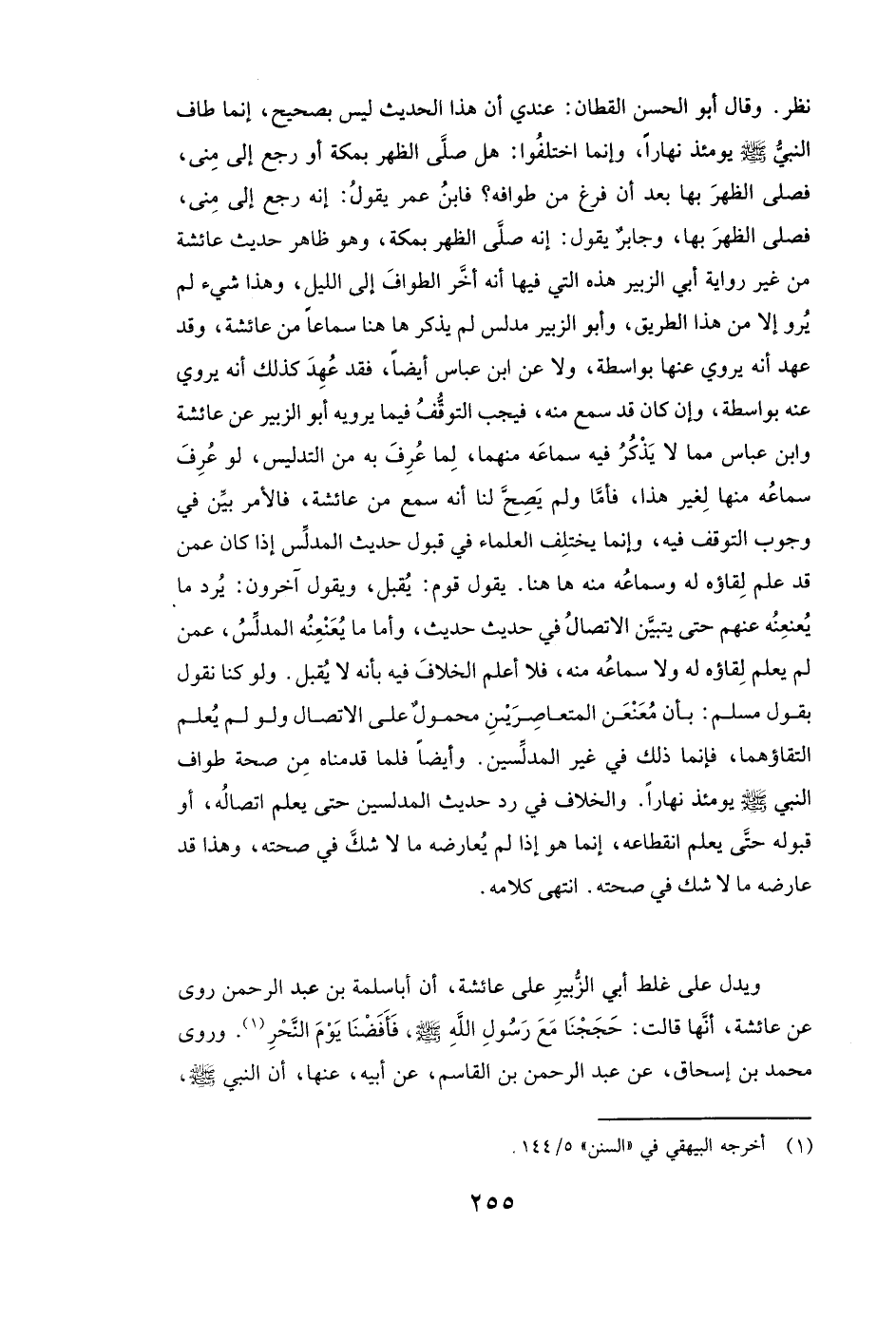 وَقَالَ أَبُو الْحَسَنِ الْقَطَّانُ: عِنْدِي أَنَّ هَذَا الْحَدِيثَ لَيْسَ بِصَحِيحٍ، إِنَّمَا طَافَ النَّبِيُّ صَلَّى اللَّهُ عَلَيْهِ وَسَلَّمَ يَوْمَئِذٍ نَهَارًا، وَإِنَّمَا اخْتَلَفُوا: هَلْ صَلَّى الظُّهْرَ بِمَكَّةَ أَوْ رَجَعَ إِلَى مِنًى، فَصَلَّى الظُّهْرَ بِهَا بَعْدَ أَنْ فَرَغَ مِنْ طَوَافِهِ؟ فابن عمر يَقُولُ: إِنَّهُ رَجَعَ إِلَى مِنًى، فَصَلَّى الظُّهْرَ بِهَا، وجابر يَقُولُ: إِنَّهُ صَلَّى الظُّهْرَ بِمَكَّةَ، وَهُوَ ظَاهِرُ حَدِيثِ عائشة مِنْ غَيْرِ رِوَايَةِ أبي الزبير هَذِهِ الَّتِي فِيهَا أَنَّهُ أَخَّرَ الطَّوَافَ إِلَى اللَّيْلِ، وَهَذَا شَيْءٌ لَمْ يُرْوَ إِلَّا مِنْ هَذَا الطَّرِيقِ وأبو الزبير مُدَلِّسٌ لَمْ يَذْكُرْ هَاهُنَا سَمَاعًا مِنْ عائشة، وَقَدْ عُهِدَ أَنَّهُ يَرْوِي عَنْهَا بِوَاسِطَةٍ، وَلَا عَنِ ابْنِ عَبَّاسٍ أَيْضًا، فَقَدْ عُهِدَ كَذَلِكَ أَنَّهُ يَرْوِي عَنْهُ بِوَاسِطَةٍ، وَإِنْ كَانَ قَدْ سَمِعَ مِنْهُ فَيَجِبُ التَّوَقُّفُ فِيمَا يَرْوِيهِ أبو الزبير عَنْ عائشة وَابْنِ عَبَّاسٍ مِمَّا لَا يَذْكُرُ فِيهِ سَمَاعَهُ مِنْهُمَا، لِمَا عُرِفَ بِهِ مِنَ التَّدْلِيسِ لَوْ عُرِفَ سَمَاعُهُ مِنْهَا لِغَيْرِ هَذَا، فَأَمَّا وَلَمْ يَصِحَّ لَنَا أَنَّهُ سَمِعَ مِنْ عائشة، فَالْأَمْرُ بَيِّنٌ فِي وُجُوبِ التَّوَقُّفِ فِيهِ، وَإِنِّمَا يَخْتَلِفُ الْعُلَمَاءُ فِي قَبُولِ حَدِيثِ الْمُدَلِّسِ إِذَا كَانَ عَمَّنْ قَدْ عُلِمَ لِقَاؤُهُ لَهُ وَسَمَاعُهُ مِنْهُ هَاهُنَا.