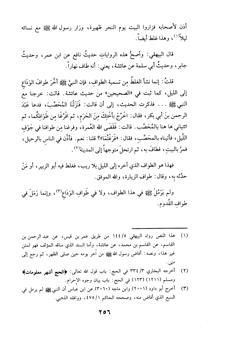 قَالَ البيهقي: وَأَصَحُّ هَذِهِ الرِّوَايَاتِ حَدِيثُ نافع عَنِ ابْنِ عُمَرَ وَحَدِيثُ جابر وَحَدِيثُ أبي سلمة عَنْ عائشة يَعْنِي: أَنَّهُ طَافَ نَهَارًا. قُلْتُ: إِنَّمَا نَشَأَ الْغَلَطُ مِنْ تَسْمِيَةِ الطَّوَافِ، فَإِنَّ النَّبِيَّ صَلَّى اللَّهُ عَلَيْهِ وَسَلَّمَ أَخَّرَ طَوَافَ الْوَدَاعِ إِلَى اللَّيْلِ، كَمَا ثَبَتَ فِي " الصَّحِيحَيْنِ " مِنْ حَدِيثِ عائشة. قَالَتْ: خَرَجْنَا مَعَ النَّبِيِّ صَلَّى اللَّهُ عَلَيْهِ وَسَلَّمَ. . . فَذَكَرَتِ الْحَدِيثَ، إِلَى أَنْ قَالَتْ: «فَنَزَلْنَا الْمُحَصَّبَ، فَدَعَا عَبْدَ الرَّحْمَنِ بْنَ أَبِي بَكْرٍ، فَقَالَ: اخْرُجْ بِأُخْتِكَ مِنَ الْحَرَمِ، ثُمَّ افْرُغَا مِنْ طَوَافِكُمَا، ثُمَّ ائْتِيَانِي هَاهُنَا بِالْمُحَصَّبِ. قَالَتْ: فَقَضَى اللَّهُ الْعُمْرَةَ، وَفَرَغْنَا مِنْ طَوَافِنَا فِي جَوْفِ اللَّيْلِ، فَأَتَيْنَاهُ بِالْمُحَصَّبِ، فَقَالَ: " فَرَغْتُمَا "؟ قُلْنَا: نَعَمْ. فَأَذَّنَ فِي النَّاسِ بِالرَّحِيلِ، فَمَرَّ بِالْبَيْتِ فَطَافَ بِهِ، ثُمَّ ارْتَحَلَ مُتَوَجِّهًا إِلَى الْمَدِينَةِ» . فَهَذَا هُوَ الطَّوَافُ الَّذِي أَخَّرَهُ إِلَى اللَّيْلِ بِلَا رَيْبٍ، فَغَلِطَ فِيهِ أبو الزبير، أَوْ مَنْ حَدَّثَهُ بِهِ، وَقَالَ: "طَوَافَ الزِّيَارَةِ "، وَاللَّهُ الْمُوَفِّقُ.