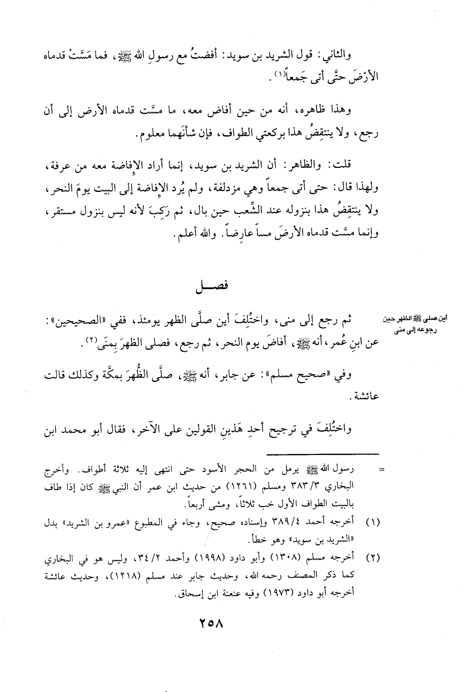 وَالثَّانِي: (قَوْلُ الشريد بن سويد: «أَفَضْتُ مَعَ رَسُولِ اللَّهِ صَلَّى اللَّهُ عَلَيْهِ وَسَلَّمَ فَمَا مَسَّتْ قَدَمَاهُ الْأَرْضَ حَتَّى أَتَى جَمْعًا» ) وَهَذَا ظَاهِرُهُ أَنَّهُ مِنْ حِينِ أَفَاضَ مَعَهُ مَا مَسَّتْ قَدَمَاهُ الْأَرْضَ إِلَى أَنْ رَجَعَ، وَلَا يَنْتَقِضُ هَذَا بِرَكْعَتَيِ الطَّوَافِ، فَإِنَّ شَأْنَهُمَا مَعْلُومٌ. قُلْتُ: وَالظَّاهِرُ أَنَّ الشريد بن سويد، إِنَّمَا أَرَادَ الْإِفَاضَةَ مَعَهُ مِنْ عَرَفَةَ، وَلِهَذَا قَالَ: حَتَّى أَتَى جَمْعًا وَهِيَ مُزْدَلِفَةُ، وَلَمْ يُرِدِ الْإِفَاضَةَ إِلَى الْبَيْتِ يَوْمَ النَّحْرِ، وَلَا يَنْتَقِضُ هَذَا بِنُزُولِهِ عِنْدَ الشِّعْبِ حِينَ بَالَ، ثُمَّ رَكِبَ؛ لِأَنَّهُ لَيْسَ بِنُزُولٍ مُسْتَقِرٍّ، وَإِنَّمَا مَسَّتْ قَدَمَاهُ الْأَرْضَ مَسًّا عَارِضًا. وَاللَّهُ أَعْلَمُ.