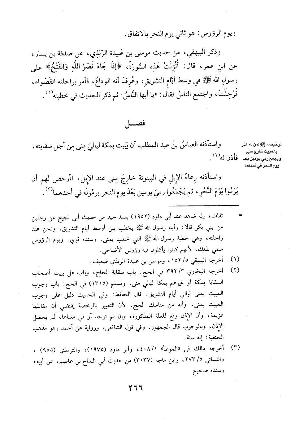 فَصْلٌ وَاسْتَأْذَنَهُ الْعَبَّاسُ بْنُ عَبْدِ الْمُطَّلِبِ أَنْ يَبِيتَ بِمَكَّةَ لَيَالِيَ مِنًى مِنْ أَجْلِ سِقَايَتِهِ فَأَذِنَ لَهُ. وَاسْتَأْذَنَهُ رِعَاءُ الْإِبِلِ فِي الْبَيْتُوتَةِ خَارِجَ مِنًى عِنْدَ الْإِبِلِ، فَأَرْخَصَ لَهُمْ أَنْ يَرْمُوا يَوْمَ النَّحْرِ، ثُمَّ يَجْمَعُوا رَمْيَ يَوْمَيْنِ بَعْدَ يَوْمِ النَّحْرِ يَرْمُونَهُ فِي أَحَدِهِمَا.