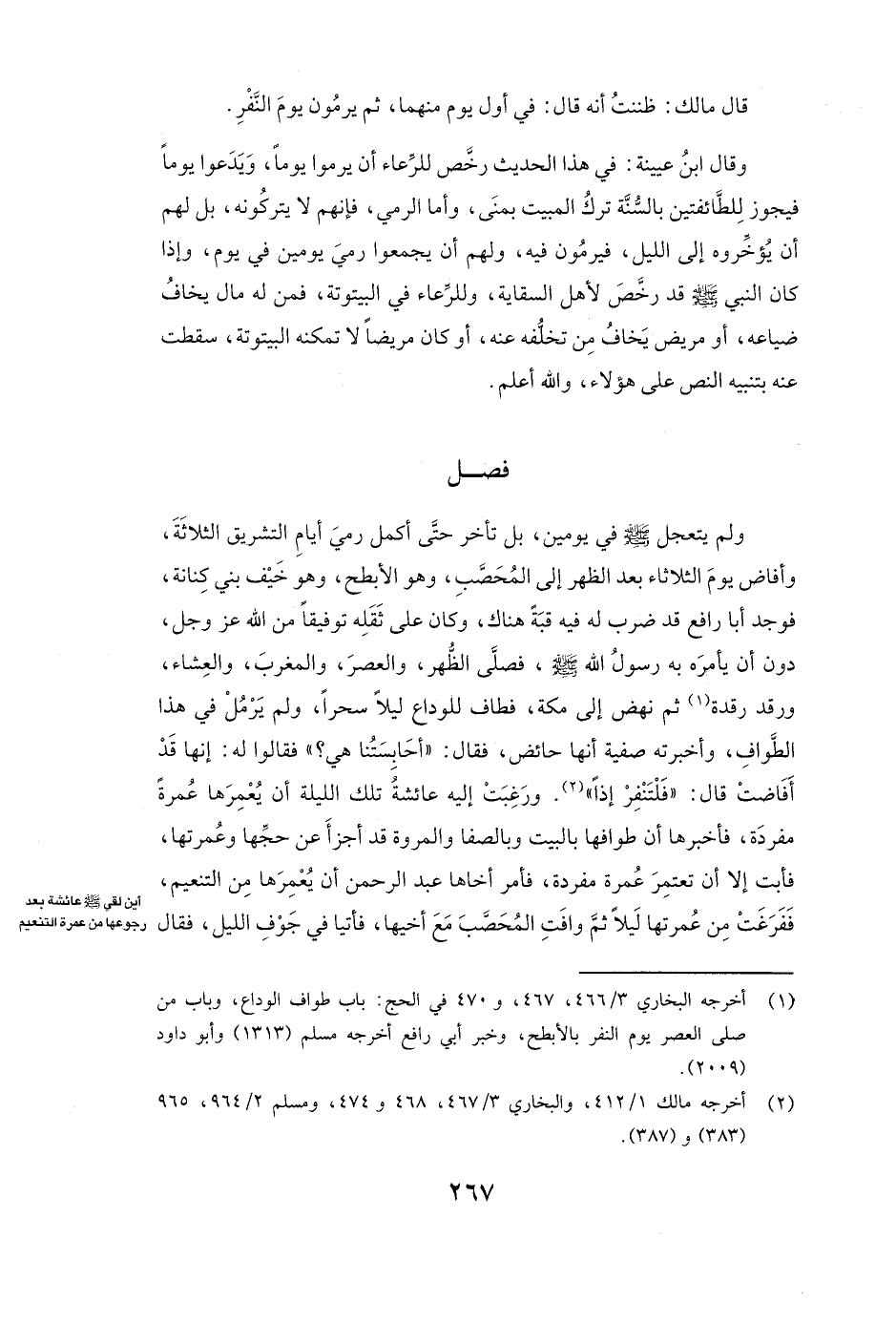 وَلَمْ يَتَعَجَّلْ صَلَّى اللَّهُ عَلَيْهِ وَسَلَّمَ فِي يَوْمَيْنِ، بَلْ تَأَخَّرَ حَتَّى أَكْمَلَ رَمْيَ أَيَّامِ التَّشْرِيقِ الثَّلَاثَةِ، وَأَفَاضَ يَوْمَ الثُّلَاثَاءِ بَعْدَ الظُّهْرِ إِلَى الْمُحَصَّبِ، وَهُوَ الْأَبْطَحُ، وَهُوَ خَيْفُ بَنِي كِنَانَةَ، فَوَجَدَ أبا رافع قَدْ ضَرَبَ لَهُ فِيهِ قُبَّةً هُنَاكَ، وَكَانَ عَلَى ثِقْلِهِ تَوْفِيقًا مِنَ اللَّهِ عَزَّ وَجَلَّ دُونَ أَنْ يَأْمُرَهُ بِهِ رَسُولُ اللَّهِ صَلَّى اللَّهُ عَلَيْهِ وَسَلَّمَ، فَصَلَّى الظُّهْرَ وَالْعَصْرَ وَالْمَغْرِبَ وَالْعِشَاءَ، وَرَقَدَ رَقْدَةً، ثُمَّ نَهَضَ إِلَى مَكَّةَ، فَطَافَ لِلْوَدَاعِ لَيْلًا سَحَرًا، وَلَمْ يَرْمُلْ فِي هَذَا الطَّوَافِ، ( «وَأَخْبَرَتْهُ صفية أَنَّهَا حَائِضٌ فَقَالَ: " أَحَابِسَتُنَا هِيَ؟ " فَقَالُوا لَهُ إِنَّهَا قَدْ أَفَاضَتْ قَالَ: " فَلْتَنْفِرْ إِذًا» ) وَرَغِبَتْ إِلَيْهِ عائشة تَلِكَ اللَّيْلَةَ أَنْ يُعْمِرَهَا عُمْرَةً مُفْرَدَةً، فَأَخْبَرَهَا أَنَّ طَوَافَهَا بِالْبَيْتِ وَبِالصَّفَا وَالْمَرْوَةِ، قَدْ أَجْزَأَ عَنْ حَجِّهَا وَعُمْرَتِهَا، فَأَبَتْ إِلَّا أَنْ تَعْتَمِرَ عُمْرَةً مُفْرَدَةً، فَأَمَرَ أَخَاهَا عبد الرحمن أَنْ يُعْمِرَهَا مِنَ التَّنْعِيمِ، فَفَرَغَتْ مِنْ عُمْرَتِهَا لَيْلًا، ثُمَّ وَافَتِ الْمُحَصَّبَ مَعَ أَخِيهَا، فَأَتَيَا فِي جَوْفِ اللَّيْلِ فَقَالَ