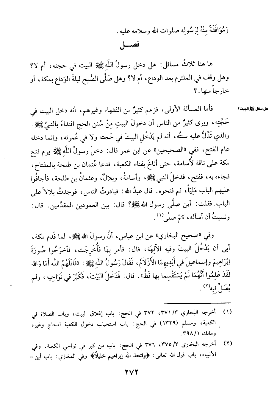 فَأَمَّا الْمَسْأَلَةُ الْأُولَى، فَزَعَمَ كَثِيرٌ مِنَ الْفُقَهَاءِ وَغَيْرِهِمْ أَنَّهُ دَخَلَ الْبَيْتَ فِي حَجَّتِهِ، وَيَرَى كَثِيرٌ مِنَ النَّاسِ أَنَّ دُخُولَ الْبَيْتِ مِنْ سُنَنِ الْحَجِّ اقْتِدَاءً بِالنَّبِيِّ صَلَّى اللَّهُ عَلَيْهِ وَسَلَّمَ. وَالَّذِي تَدُلُّ عَلَيْهِ سُنَّتُهُ أَنَّهُ لَمْ يَدْخُلِ الْبَيْتَ فِي حَجَّتِهِ وَلَا فِي عُمْرَتِهِ، وَإِنَّمَا دَخَلَهُ عَامَ الْفَتْحِ فَفِي " الصَّحِيحَيْنِ ( «عَنِ ابْنِ عُمَرَ، قَالَ: دَخَلَ رَسُولُ اللَّهِ صَلَّى اللَّهُ عَلَيْهِ وَسَلَّمَ يَوْمَ فَتْحِ مَكَّةَ عَلَى نَاقَةٍ لأسامة، حَتَّى أَنَاخَ بِفِنَاءِ الْكَعْبَةِ، فَدَعَا عُثْمَانُ بْنُ طَلْحَةَ بِالْمِفْتَاحِ، فَجَاءَهُ بِهِ، فَفَتَحَ فَدَخَلَ النَّبِيُّ صَلَّى اللَّهُ عَلَيْهِ وَسَلَّمَ وأسامة، وبلال، وَعُثْمَانُ بْنُ طَلْحَةَ، فَأَجَافُوا عَلَيْهِمُ الْبَابَ مَلِيًّا، ثُمَّ فَتَحُوهُ. قَالَ عبد الله: فَبَادَرْتُ النَّاسَ، فَوَجَدْتُ بلالا عَلَى الْبَابِ. فَقُلْتُ: أَيْنَ صَلَّى رَسُولُ اللَّهِ صَلَّى اللَّهُ عَلَيْهِ وَسَلَّمَ؟ قَالَ: بَيْنَ الْعَمُودَيْنِ الْمُقَدَّمَيْنِ. قَالَ: وَنَسِيتُ أَنْ أَسْأَلَهُ كَمْ صَلَّى» ) .
