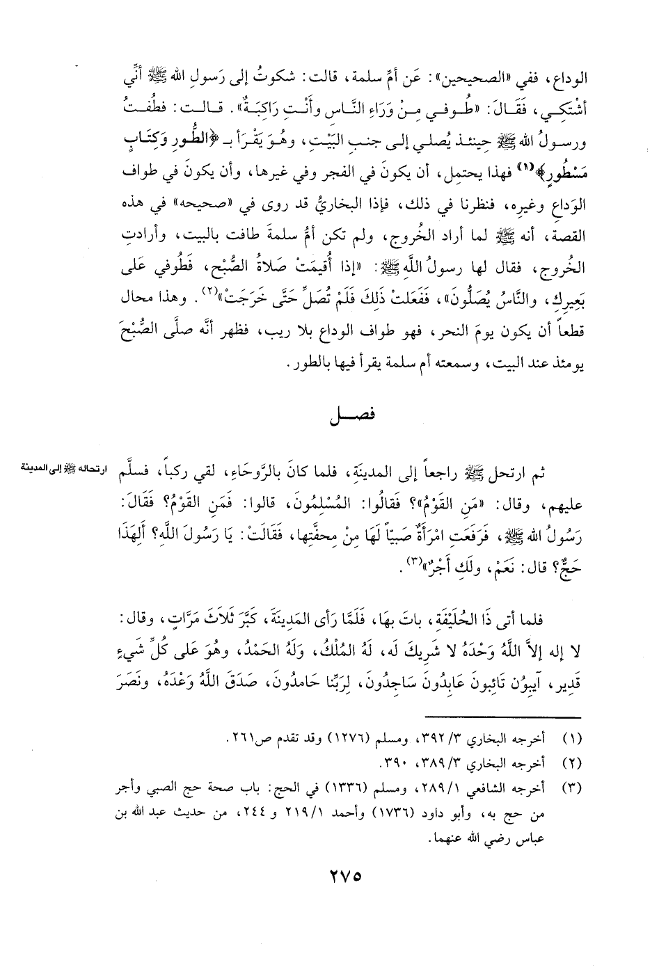 الْوَدَاعِ فَفِي " الصَّحِيحَيْنِ ": عَنْ أم سلمة، قَالَتْ: ( «شَكَوْتُ إِلَى رَسُولِ اللَّهِ صَلَّى اللَّهُ عَلَيْهِ وَسَلَّمَ أَنِّي أَشْتَكِي، فَقَالَ: طُوفِي مِنْ وَرَاءِ النَّاسِ وَأَنْتِ رَاكِبَةٌ. قَالَتْ: فَطُفْتُ وَرَسُولُ اللَّهِ صَلَّى اللَّهُ عَلَيْهِ وَسَلَّمَ حِينَئِذٍ يُصَلِّي إِلَى جَنْبِ الْبَيْتِ، وَهُوَ يَقْرَأُ بِ {وَالطُّورِ - وَكِتَابٍ مَسْطُورٍ} [الطور: 1 - 2] » ) فَهَذَا يَحْتَمِلُ أَنْ يَكُونَ فِي الْفَجْرِ وَفِي غَيْرِهَا، وَأَنْ يَكُونَ فِي طَوَافِ الْوَدَاعِ وَغَيْرِهِ، فَنَظَرْنَا فِي ذَلِكَ، فَإِذَا الْبُخَارِيُّ قَدْ رَوَى فِي " صَحِيحِهِ " فِي هَذِهِ الْقِصَّةِ «أَنَّهُ صَلَّى اللَّهُ عَلَيْهِ وَسَلَّمَ لَمَّا أَرَادَ الْخُرُوجَ، وَلَمْ تَكُنْ أم سلمة طَافَتْ بِالْبَيْتِ، وَأَرَادَتِ الْخُرُوجَ، فَقَالَ لَهَا رَسُولُ اللَّهِ صَلَّى اللَّهُ عَلَيْهِ وَسَلَّمَ: (إِذَا أُقِيمَتْ صَلَاةُ الصُّبْحِ، فَطُوفِي عَلَى بَعِيرِكِ وَالنَّاسُ يُصَلُّونَ، فَفَعَلَتْ ذَلِكَ، فَلَمْ تُصَلِّ حَتَّى خَرَجَتْ» ) . وَهَذَا مُحَالٌ قَطْعًا أَنْ يَكُونَ يَوْمَ النَّحْرِ فَهُوَ طَوَافُ الْوَدَاعِ بِلَا رَيْبٍ، فَظَهَرَ أَنَّهُ صَلَّى الصُّبْحَ يَوْمَئِذٍ عِنْدَ الْبَيْتِ، وَسَمِعَتْهُ أم سلمة يَقْرَأُ فِيهَا بِالطُّورِ.