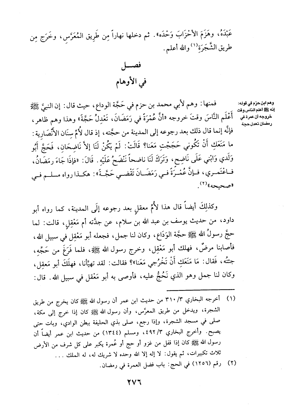 فَمِنْهَا: وَهْمٌ لأبي محمد بن حزم فِي حَجَّةِ الْوَدَاعِ حَيْثُ قَالَ: إِنَّ النَّبِيَّ صَلَّى اللَّهُ عَلَيْهِ وَسَلَّمَ أَعْلَمَ النَّاسَ وَقْتَ خُرُوجِهِ ( «أَنَّ عُمْرَةً فِي رَمَضَانَ تَعْدِلُ حَجَّةً» ) وَهَذَا وَهْمٌ ظَاهِرٌ؛ فَإِنَّهُ إِنَّمَا قَالَ ذَلِكَ بَعْدَ رُجُوعِهِ إِلَى الْمَدِينَةِ مِنْ حَجَّتِهِ، إِذْ قَالَ لأم سنان الأنصارية: ( «مَا مَنَعَكِ أَنْ تَكُونِي حَجَجْتِ مَعَنَا؟ قَالَتْ: لَمْ يَكُنْ لَنَا إِلَّا نَاضِحَانِ فَحَجَّ أَبُو وَلَدِي وَابْنِي عَلَى نَاضِحٍ، وَتَرَكَ لَنَا نَاضِحًا نَنْضَحُ عَلَيْهِ. قَالَ: فَإِذَا جَاءَ رَمَضَانُ فَاعْتَمِرِي، فَإِنَّ عُمْرَةً فِي رَمَضَانَ تَقْضِي حَجَّةً» ) هَكَذَا رَوَاهُ مسلم فِي " صَحِيحِهِ ".