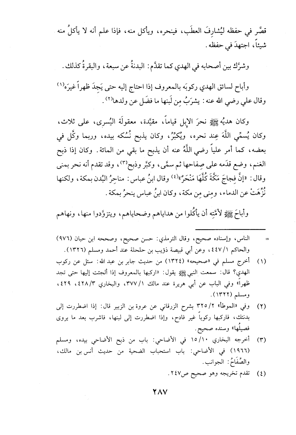 وَكَانَ هَدْيُهُ صَلَّى اللَّهُ عَلَيْهِ وَسَلَّمَ نَحْرَ الْإِبِلِ قِيَامًا، مُقَيَّدَةً مَعْقُولَةَ الْيُسْرَى، عَلَى ثَلَاثٍ وَكَانَ يُسَمِّي اللَّهَ عِنْدَ نَحْرِهِ، وَيُكَبِّرُ، وَكَانَ يَذْبَحُ نُسُكَهُ بِيَدِهِ، وَرُبَّمَا وَكَّلَ فِي بَعْضِهِ كَمَا أَمَرَ عليا رَضِيَ اللَّهُ عَنْهُ أَنْ يَذْبَحَ مَا بَقِيَ مِنَ الْمِائَةِ.