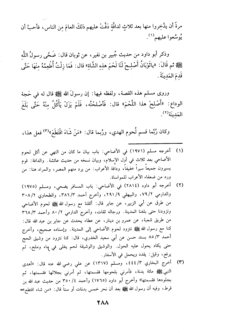 مَرَّةً أَنْ يَدَّخِرُوا مِنْهَا بَعْدَ ثَلَاثٍ لِدَافَّةٍ دَفَّتْ عَلَيْهِمْ ذَلِكَ الْعَامَ مِنَ النَّاسِ، فَأُحِبُّ أَنْ يُوَسِّعُوا عَلَيْهِمْ، وَذَكَرَ أبو داود مِنْ حَدِيثِ جُبَيْرِ بْنِ نُفَيْرٍ عَنْ ثَوْبَانَ قَالَ: «ضَحَّى رَسُولُ اللَّهِ صَلَّى اللَّهُ عَلَيْهِ وَسَلَّمَ، ثُمَّ قَالَ: (يَا ثَوْبَانُ أَصْلِحْ لَنَا لَحْمَ هَذِهِ الشَّاةِ» ) قَالَ: فَمَا زِلْتُ أُطْعِمُهُ مِنْهَا حَتَّى قَدِمَ الْمَدِينَةَ.