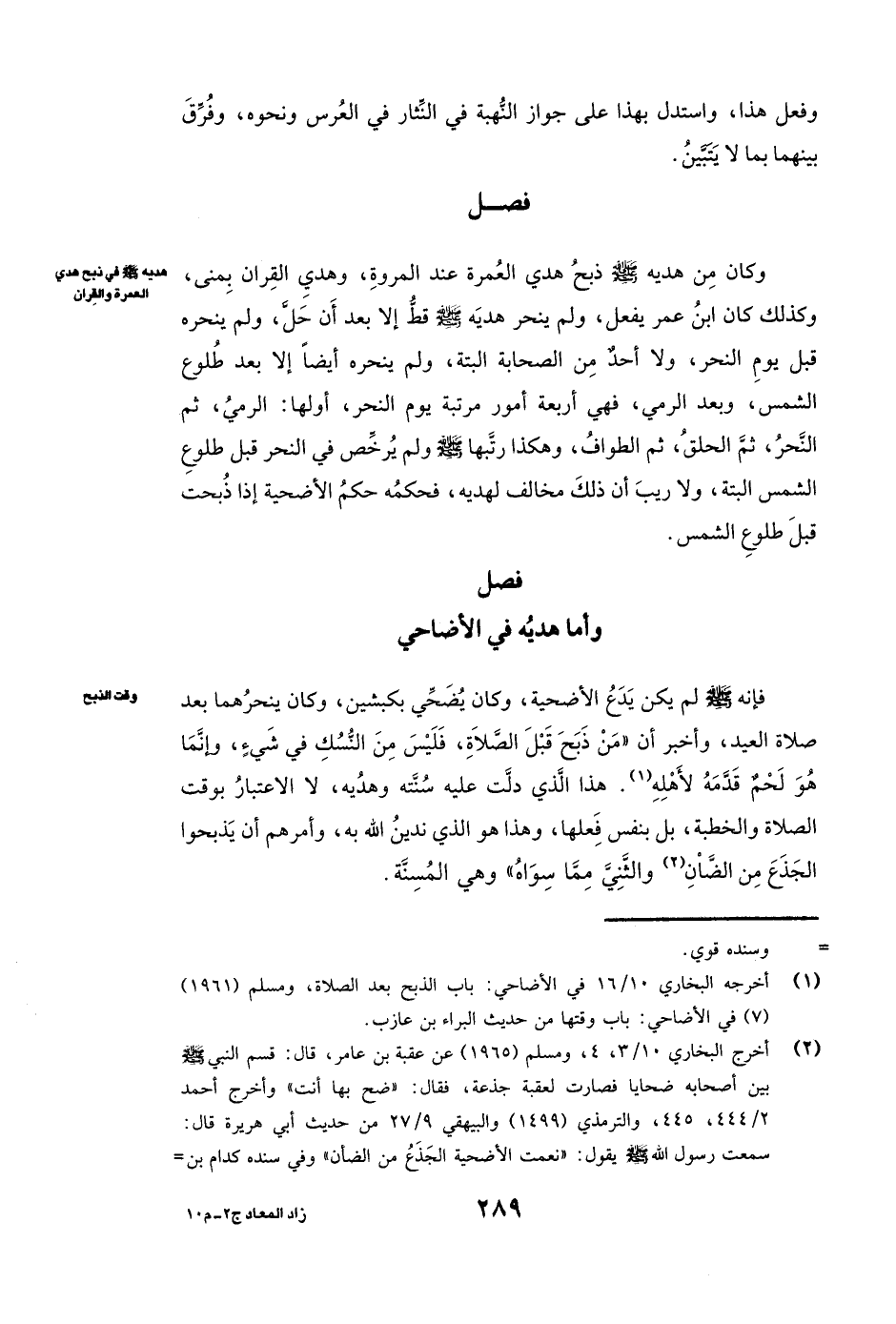 فَصْلٌ وَأَمَّا هَدْيُهُ فِي الْأَضَاحِي فَإِنَّهُ صَلَّى اللَّهُ عَلَيْهِ وَسَلَّمَ لَمْ يَكُنْ يَدَعُ الْأُضْحِيَّةَ، وَكَانَ يُضَحِّي بِكَبْشَيْنِ، وَكَانَ يَنْحَرُهُمَا بَعْدَ صَلَاةِ الْعِيدِ، وَأَخْبَرَ أَنَّ ( «مَنْ ذَبَحَ قَبْلَ الصَّلَاةِ فَلَيْسَ مِنَ النُّسُكِ فِي شَيْءٍ، وَإِنَّمَا هُوَ لَحْمٌ قَدَّمَهُ لِأَهْلِهِ» ) هَذَا الَّذِي دَلَّتْ عَلَيْهِ سُنَّتُهُ وَهَدْيُهُ لَا الِاعْتِبَارُ بِوَقْتِ الصَّلَاةِ وَالْخُطْبَةِ، بَلْ بِنَفْسِ فِعْلِهَا، وَهَذَا هُوَ الَّذِي نَدِينُ اللَّهَ بِهِ ( «وَأَمَرَهُمْ أَنْ يَذْبَحُوا الْجَذَعَ مِنَ الضَّأْنِ وَالثَّنِيَّ مِمَّا سِوَاهُ» ) وَهِيَ الْمُسِنَّةُ.