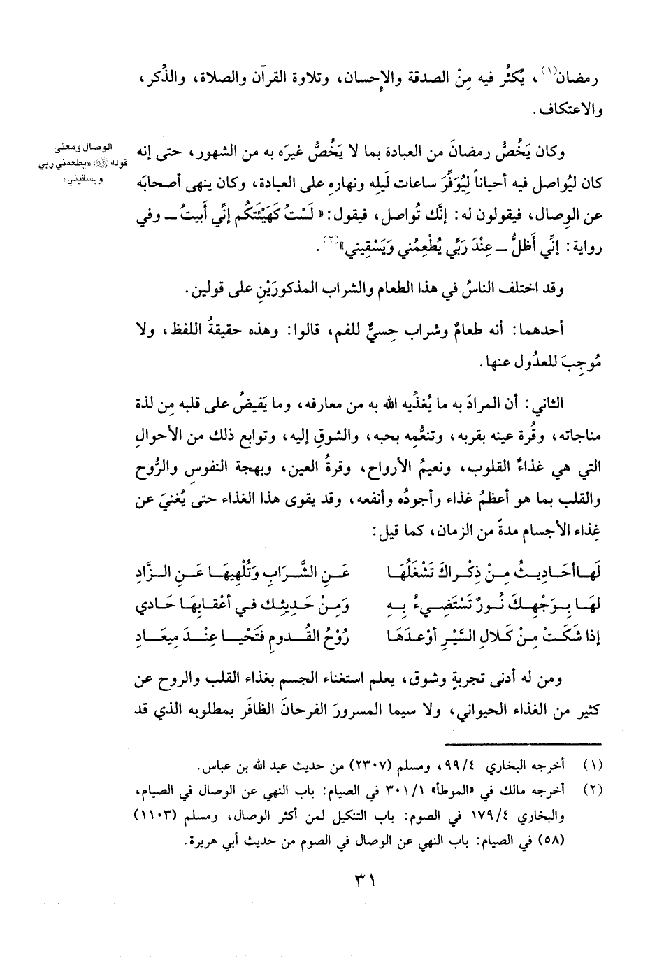 وَمَنْ لَهُ أَدْنَى تَجْرِبَةٍ وَشَوْقٍ يَعْلَمُ اسْتِغْنَاءَ الْجِسْمِ بِغِذَاءِ الْقَلْبِ وَالرُّوحِ عَنْ كَثِيرٍ مِنَ الْغِذَاءِ الْحَيَوَانِيِّ، وَلَا سِيَّمَا الْمَسْرُورُ الْفَرْحَانُ الظَّافِرُ بِمَطْلُوبِهِ الَّذِي قَدْ