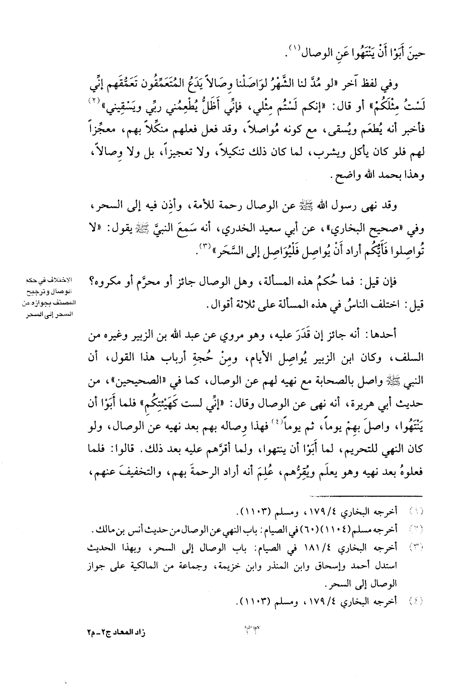 وَقَدْ نَهَى رَسُولُ اللَّهِ صَلَّى اللَّهُ عَلَيْهِ وَسَلَّمَ عَنِ الْوِصَالِ رَحْمَةً لِلْأُمَّةِ، وَأَذِنَ فِيهِ إِلَى السَّحَرِ، وَفِي " صَحِيحِ الْبُخَارِيِّ " عَنْ أَبِي سَعِيدٍ الْخُدْرِيِّ، أَنَّهُ سَمِعَ النَّبِيَّ صَلَّى اللَّهُ عَلَيْهِ وَسَلَّمَ يَقُولُ: ( «لَا تُوَاصِلُوا فَأَيُّكُمْ أَرَادَ أَنْ يُوَاصِلَ فَلْيُوَاصِلْ إِلَى السَّحَرِ» ) .