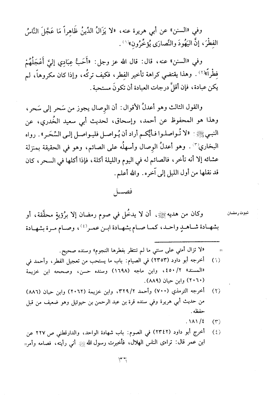 فَصْلٌ وَكَانَ مِنْ هَدْيِهِ صَلَّى اللَّهُ عَلَيْهِ وَسَلَّمَ أَنْ لَا يَدْخُلَ فِي صَوْمِ رَمَضَانَ إِلَّا بِرُؤْيَةٍ مُحَقَّقَةٍ، أَوْ بِشَهَادَةِ شَاهِدٍ وَاحِدٍ، كَمَا صَامَ بِشَهَادَةِ ابْنِ عُمَرَ، وَصَامَ مَرَّةً بِشَهَادَةِ
