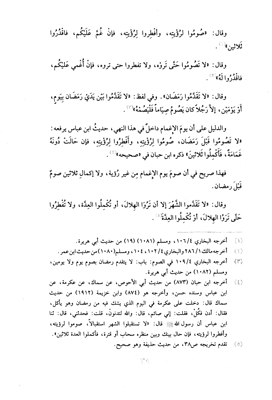 وَقَالَ: ( «لَا تَقَدَّمُوا الشَّهْرَ إِلَّا أَنْ تَرَوُا الْهِلَالَ أَوْ تُكْمِلُوا الْعِدَّةَ، وَلَا تُفْطِرُوا حَتَّى تَرَوُا الْهِلَالَ أَوْ تُكْمِلُوا الْعِدَّةَ» ) .