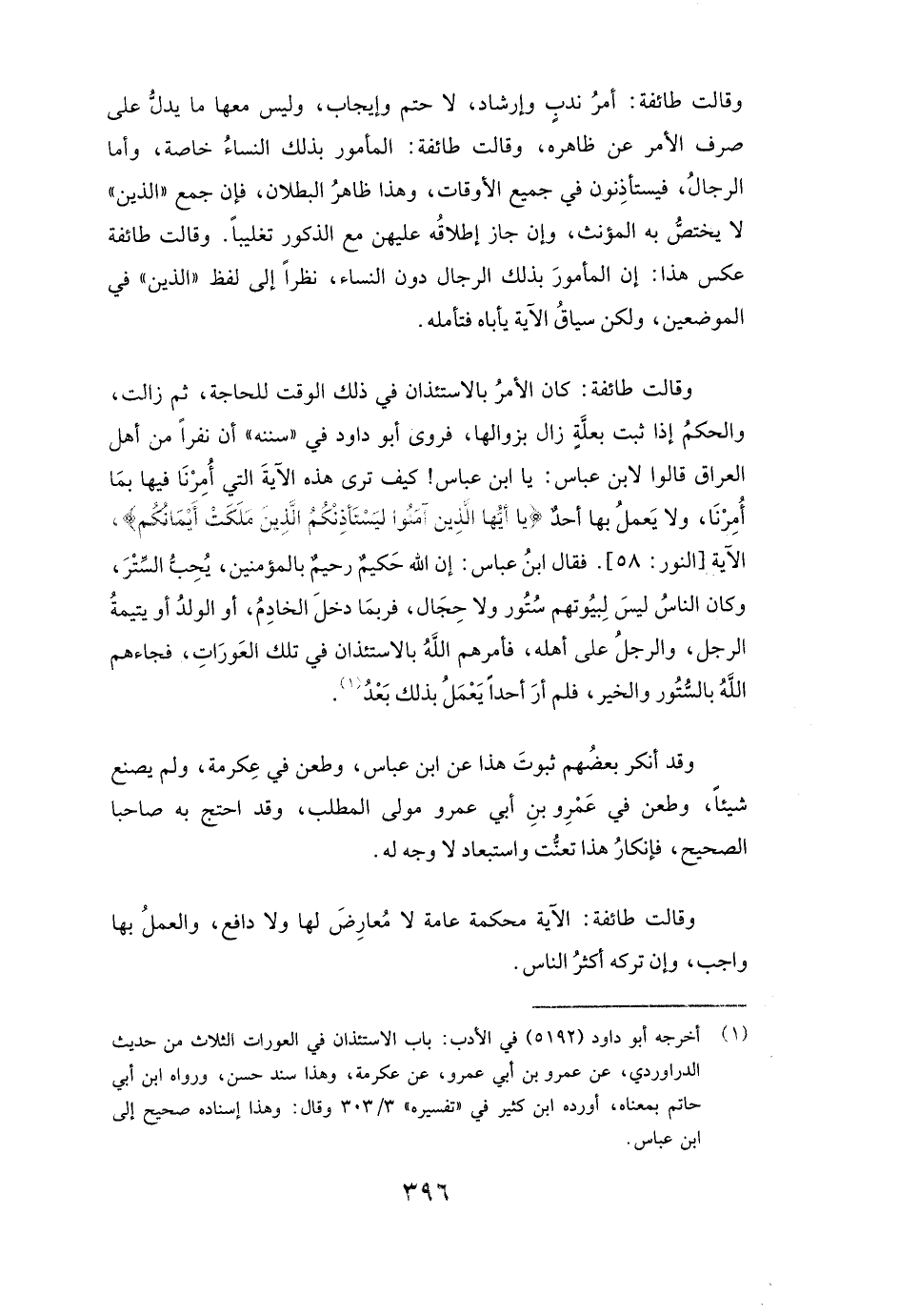 وَقَالَتْ طَائِفَةٌ: كَانَ الْأَمْرُ بِالِاسْتِئْذَانِ فِي ذَلِكَ الْوَقْتِ لِلْحَاجَةِ، ثُمَّ زَالَتْ، وَالْحُكْمُ إِذَا ثَبَتَ بِعِلَّةٍ زَالَ بِزَوَالِهَا، فَرَوَى أبو داود فِي " سُنَنِهِ " ( «أَنَّ نَفَرًا مِنْ أَهْلِ الْعِرَاقِ قَالُوا لِابْنِ عَبَّاسٍ: يَا ابْنَ عَبَّاسٍ! كَيْفَ تَرَى هَذِهِ الْآيَةَ الَّتِي أُمِرْنَا فِيهَا بِمَا أُمِرْنَا، وَلَا يَعْمَلُ بِهَا أَحَدٌ {يَاأَيُّهَا الَّذِينَ آمَنُوا لِيَسْتَأْذِنْكُمُ الَّذِينَ مَلَكَتْ أَيْمَانُكُمْ} [النور: 58] الْآيَةَ [النُّورِ: 58] . فَقَالَ ابْنُ عَبَّاسٍ: إِنَّ اللَّهَ حَكِيمٌ رَحِيمٌ بِالْمُؤْمِنِينَ، يُحِبُّ السِّتْرَ، وَكَانَ النَّاسُ لَيْسَ لِبُيُوتِهِمْ سُتُورٌ وَلَا حِجَالٌ، فَرُبَّمَا دَخَلَ الْخَادِمُ، أَوِ الْوَلَدُ أَوْ يَتِيمَةُ الرَّجُلِ، وَالرَّجُلُ عَلَى أَهْلِهِ، فَأَمَرَهُمُ اللَّهُ بِالِاسْتِئْذَانِ فِي تِلْكَ الْعَوْرَاتِ، فَجَاءَهُمُ اللَّهُ بِالسُّتُورِ وَالْخَيْرِ، فَلَمْ أَرَ أَحَدًا يَعْمَلُ بِذَلِكَ بَعْدُ» )