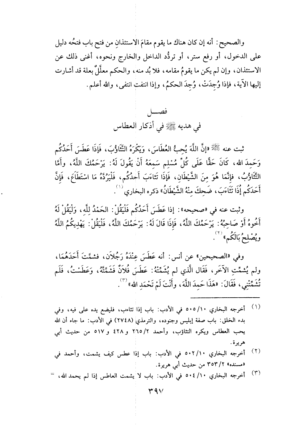 وَثَبَتَ عَنْهُ فِي " صَحِيحِهِ ": ( «إِذَا عَطَسَ أَحَدُكُمْ: فَلْيَقُلِ الْحَمْدُ لِلَّهِ، وَلْيَقُلْ لَهُ أَخُوهُ أَوْ صَاحِبُهُ: يَرْحَمُكَ اللَّهُ، فَإِذَا قَالَ لَهُ: يَرْحَمُكَ اللَّهُ، فَلْيَقُلْ يَهْدِيكُمُ اللَّهُ وَيُصْلِحُ بَالَكُمْ» )