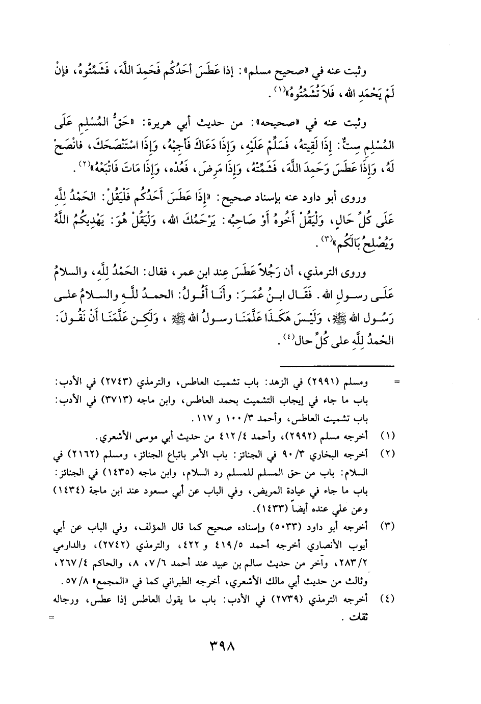 وَرَوَى الترمذي، «أَنَّ رَجُلًا عَطَسَ عِنْدَ ابْنِ عُمَرَ، فَقَالَ الْحَمْدُ لِلَّهِ وَالسَّلَامُ عَلَى رَسُولِ اللَّهِ. فَقَالَ ابْنُ عُمَرَ: (وَأَنَا أَقُولُ: الْحَمْدُ لِلَّهِ وَالسَّلَامُ عَلَى رَسُولِ اللَّهِ صَلَّى اللَّهُ عَلَيْهِ وَسَلَّمَ، وَلَيْسَ هَكَذَا عَلَّمَنَا رَسُولُ اللَّهِ صَلَّى اللَّهُ عَلَيْهِ وَسَلَّمَ، وَلَكِنْ عَلَّمَنَا أَنْ نَقُولَ الْحَمْدُ لِلَّهِ عَلَى كُلِّ حَالٍ» )