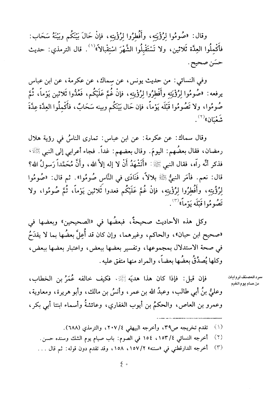 وَقَالَ: ( «صُومُوا لِرُؤْيَتِهِ وَأَفْطِرُوا لِرُؤْيَتِهِ، فَإِنْ حَالَ بَيْنَكُمْ وَبَيْنَهُ سَحَابٌ فَأَكْمِلُوا الْعِدَّةَ ثَلَاثِينَ، وَلَا تَسْتَقْبِلُوا الشَّهْرَ اسْتِقْبَالًا» ) . قَالَ الترمذي: حَدِيثٌ حَسَنٌ صَحِيحٌ.