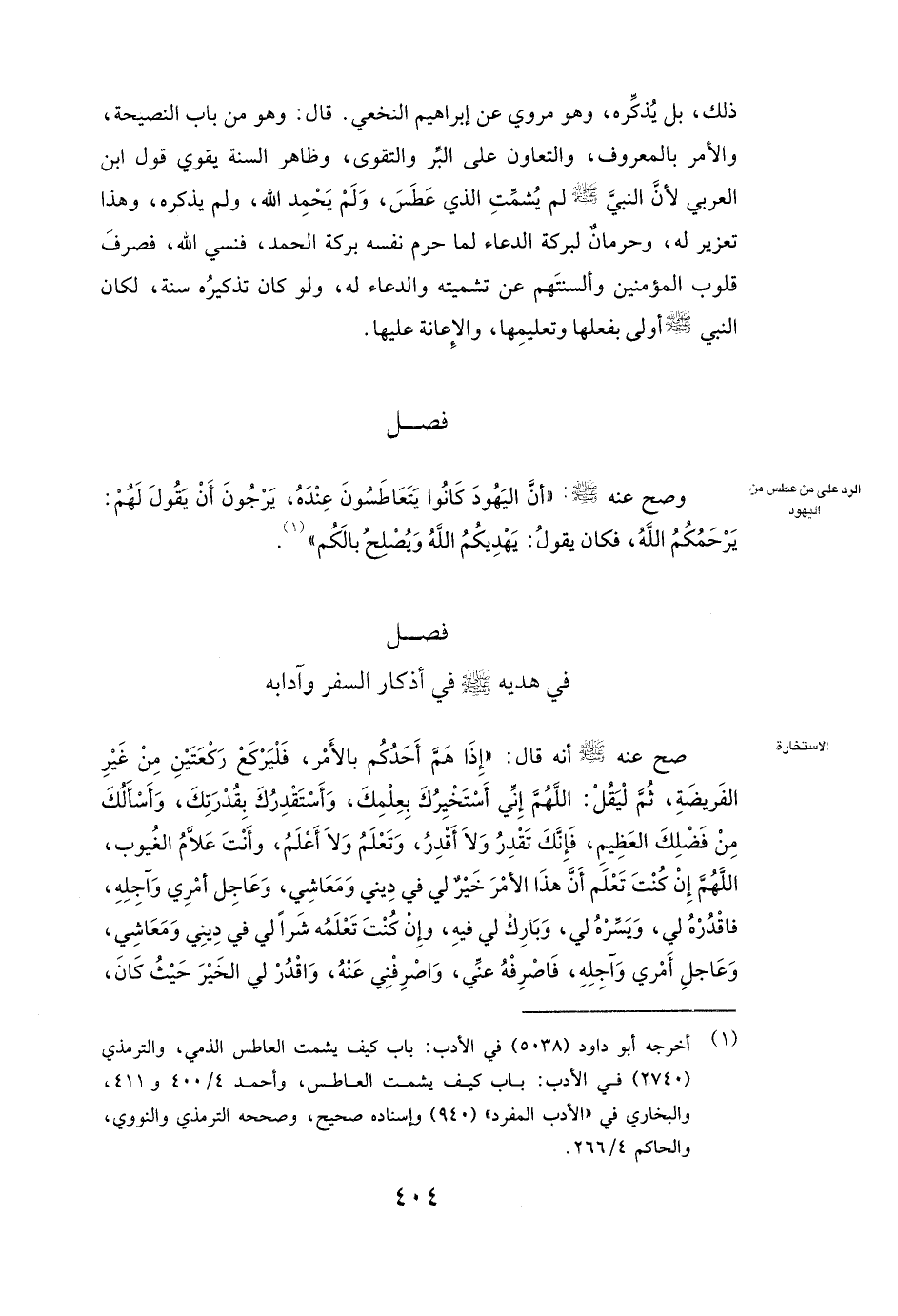 وَصَحَّ عَنْهُ صَلَّى اللَّهُ عَلَيْهِ وَسَلَّمَ ( «أَنَّ الْيَهُودَ كَانُوا يَتَعَاطَسُونَ عِنْدَهُ، يَرْجُونَ أَنْ يَقُولَ لَهُمْ: يَرْحَمُكُمُ اللَّهُ، فَكَانَ يَقُولُ: يَهْدِيكُمُ اللَّهُ وَيُصْلِحُ بَالَكُمْ» )