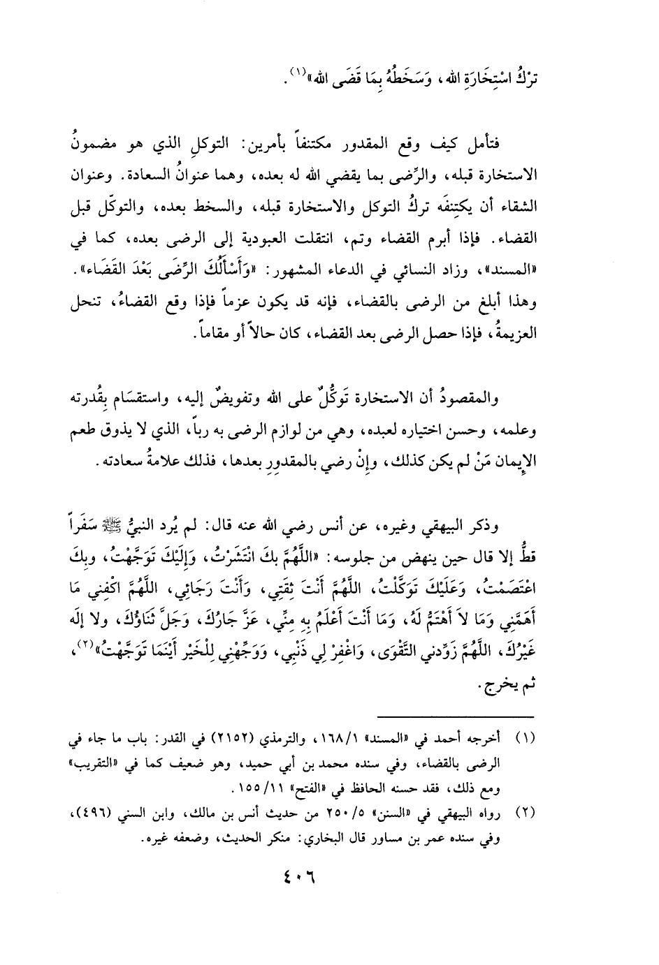 فَتَأَمَّلْ كَيْفَ وَقَعَ الْمَقْدُورُ مُكْتَنِفًا بِأَمْرَيْنِ: التَّوَكُّلِ الَّذِي هُوَ مَضْمُونُ الِاسْتِخَارَةِ قَبْلَهُ، وَالرِّضَى بِمَا يَقْضِي اللَّهُ لَهُ بَعْدَهُ، وَهُمَا عِنْوَانُ السَّعَادَةِ. وَعِنْوَانُ الشَّقَاءِ أَنْ يَكْتَنِفَهُ تَرْكُ التَّوَكُّلِ وَالِاسْتِخَارَةِ قَبْلَهُ، وَالسَّخَطُ بَعْدَهُ، وَالتَّوَكُّلُ قَبْلَ الْقَضَاءِ. فَإِذَا أُبْرِمَ الْقَضَاءُ وَتَمَّ، انْتَقَلَتِ الْعُبُودِيَّةُ إِلَى الرِّضَى بَعْدَهُ، كَمَا فِي " الْمُسْنَدِ "، وَزَادَ النَّسَائِيُّ فِي الدُّعَاءِ الْمَشْهُورِ: ( «وَأَسْأَلُكَ الرِّضَى بَعْدَ الْقَضَاءِ» ) . وَهَذَا أَبْلَغُ مِنَ الرِّضَى بِالْقَضَاءِ، فَإِنَّهُ قَدْ يَكُونُ عَزْمًا فَإِذَا وَقَعَ الْقَضَاءُ، تَنْحَلُّ الْعَزِيمَةُ، فَإِذَا حَصَلَ الرِّضَى بَعْدَ الْقَضَاءِ، كَانَ حَالًا أَوْ مَقَامًا.