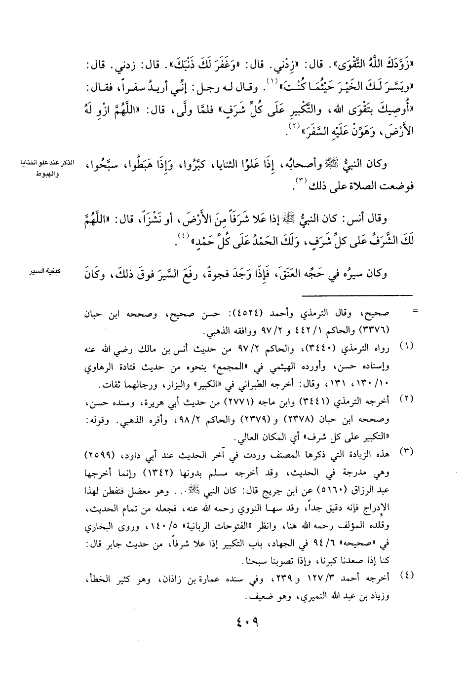 «وَقَالَ لَهُ رَجُلٌ: إِنِّي أُرِيدُ سَفَرًا، فَقَالَ (أُوصِيكَ بِتَقْوَى اللَّهِ، وَالتَّكْبِيرِ عَلَى كُلِّ شَرَفٍ " فَلَمَّا وَلَّى، قَالَ " اللَّهُمَّ ازْوِ لَهُ الْأَرْضَ، وَهَوِّنْ عَلَيْهِ السَّفَرَ) .»