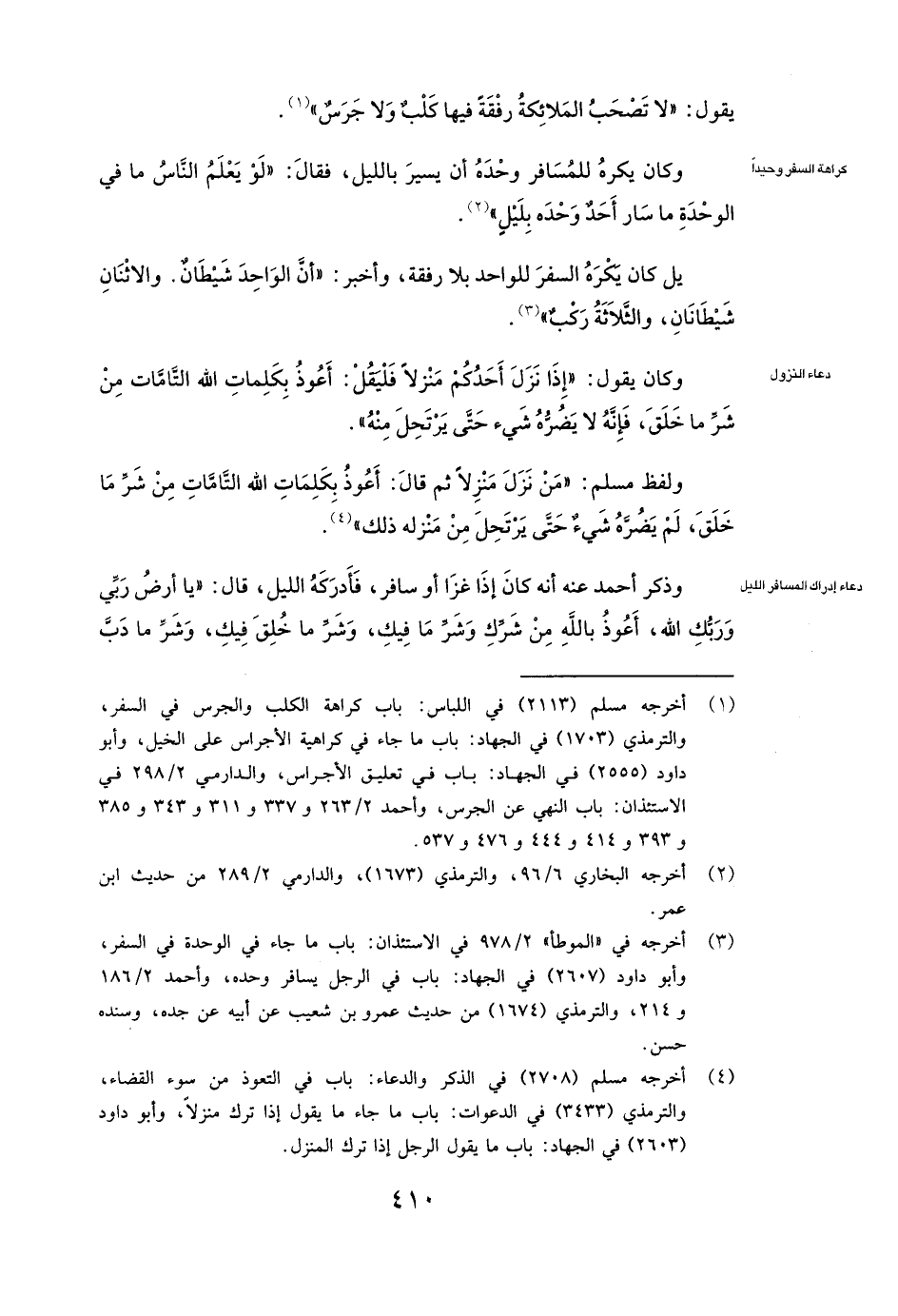 بَلْ كَانَ يَكْرَهُ السَّفَرَ لِلْوَاحِدِ بِلَا رُفْقَةٍ، وَأَخْبَرَ: ( «أَنَّ الْوَاحِدَ شَيْطَانٌ، وَالِاثْنَانِ شَيْطَانَانِ، وَالثَّلَاثَةُ رَكْبٌ» )