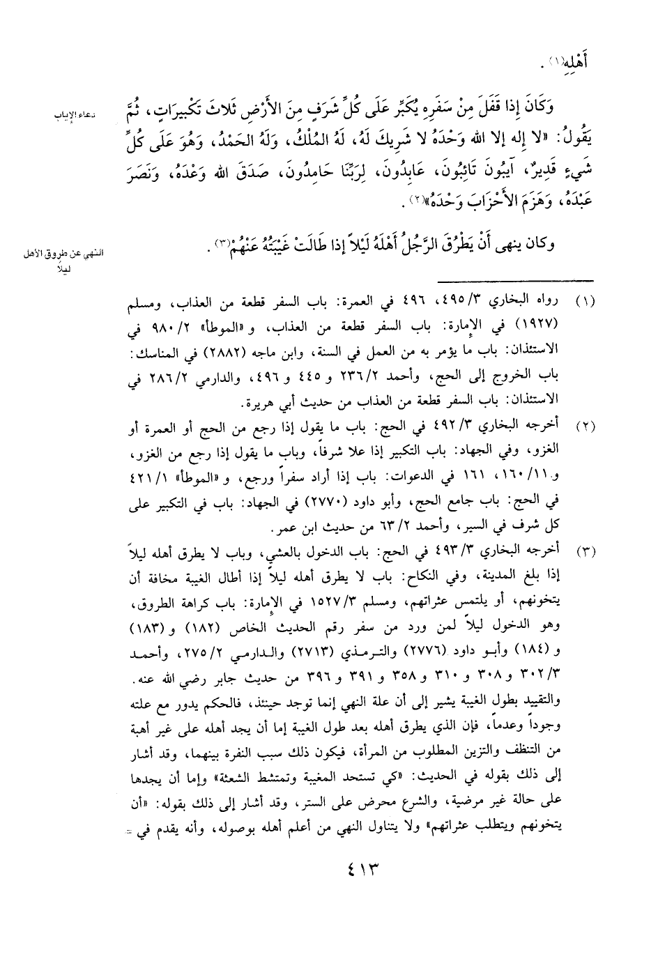 ( «وَكَانَ يَنْهَى أَنْ يَطْرُقَ الرَّجُلُ أَهْلَهُ لَيْلًا إِذَا طَالَتْ غَيْبَتُهُ عَنْهُمْ» .