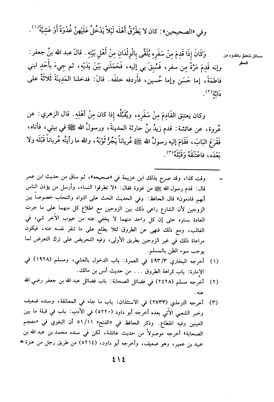 وَفِي " الصَّحِيحَيْنِ ": ( «كَانَ لَا يَطْرُقُ أَهْلَهُ لَيْلًا يَدْخُلُ عَلَيْهِنَّ غُدْوَةً أَوْ عَشِيَّةً» ) .