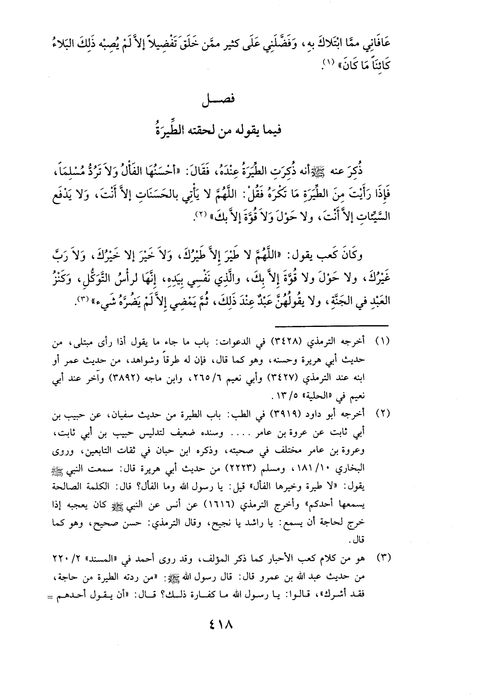 ذُكِرَ عَنْهُ صَلَّى اللَّهُ عَلَيْهِ وَسَلَّمَ «أَنَّهُ ذُكِرَتِ الطِّيَرَةُ عِنْدَهُ، فَقَالَ: (أَحْسَنُهَا الْفَأْلُ وَلَا تَرُدَّ مُسْلِمًا، فَإِذَا رَأَيْتَ مِنَ الطِّيَرَةِ مَا تَكْرَهُ فَقُلِ: اللَّهُمَّ لَا يَأْتِي بِالْحَسَنَاتِ إِلَّا أَنْتَ، وَلَا يَدْفَعُ السَّيِّئَاتِ إِلَّا أَنْتَ، وَلَا حَوْلَ وَلَا قُوَّةَ إِلَّا بِكَ» ) .