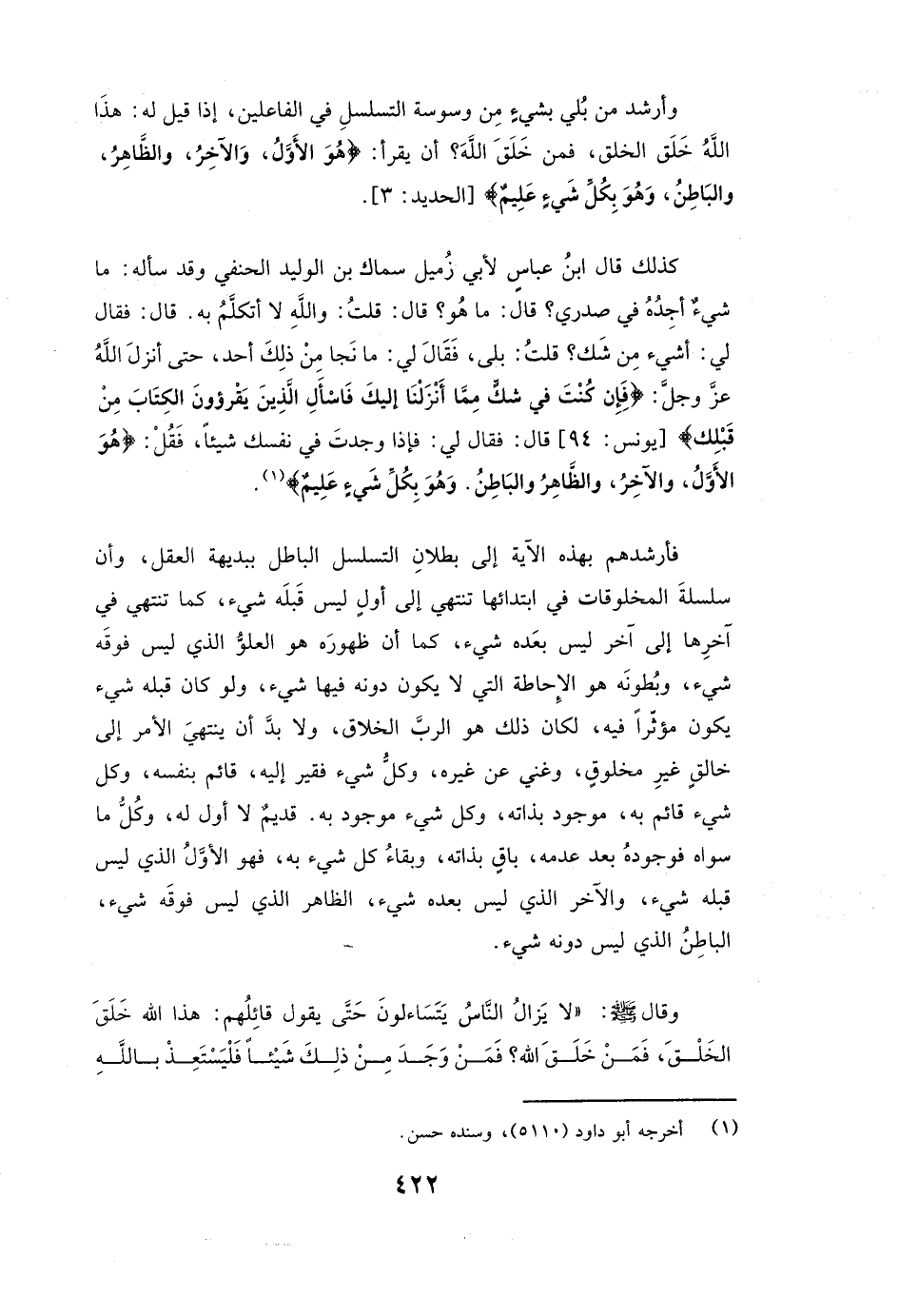 ( «وَأَرْشَدَ مَنْ بُلِيَ بِشَيْءٍ مِنْ وَسْوَسَةِ التَّسَلْسُلِ فِي الْفَاعِلِينَ، إِذَا قِيلَ لَهُ: هَذَا اللَّهُ خَلَقَ الْخَلْقَ، فَمَنْ خَلَقَ اللَّهَ؟ أَنْ يَقْرَأَ: {هُوَ الْأَوَّلُ وَالْآخِرُ وَالظَّاهِرُ وَالْبَاطِنُ وَهُوَ بِكُلِّ شَيْءٍ عَلِيمٌ} [الحديد: 3] » )) [الْحَدِيدِ: 3] .