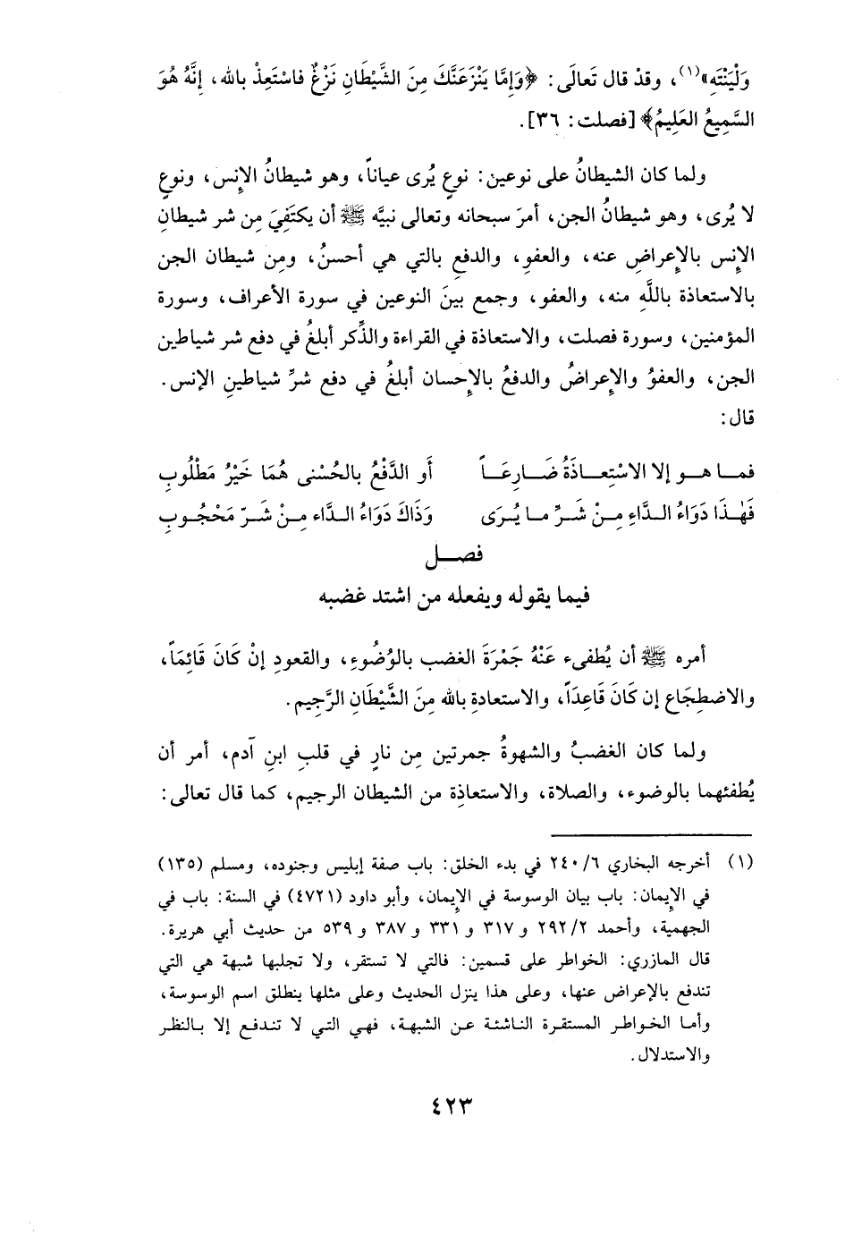 وَلَمَّا كَانَ الْغَضَبُ وَالشَّهْوَةُ جَمْرَتَيْنِ مِنْ نَارٍ فِي قَلْبِ ابْنِ آدَمَ، أَمَرَ أَنْ يُطْفِئَهُمَا بِالْوُضُوءِ وَالصَّلَاةِ، وَالِاسْتِعَاذَةِ مِنَ الشَّيْطَانِ الرَّجِيمِ، كَمَا قَالَ تَعَالَى: