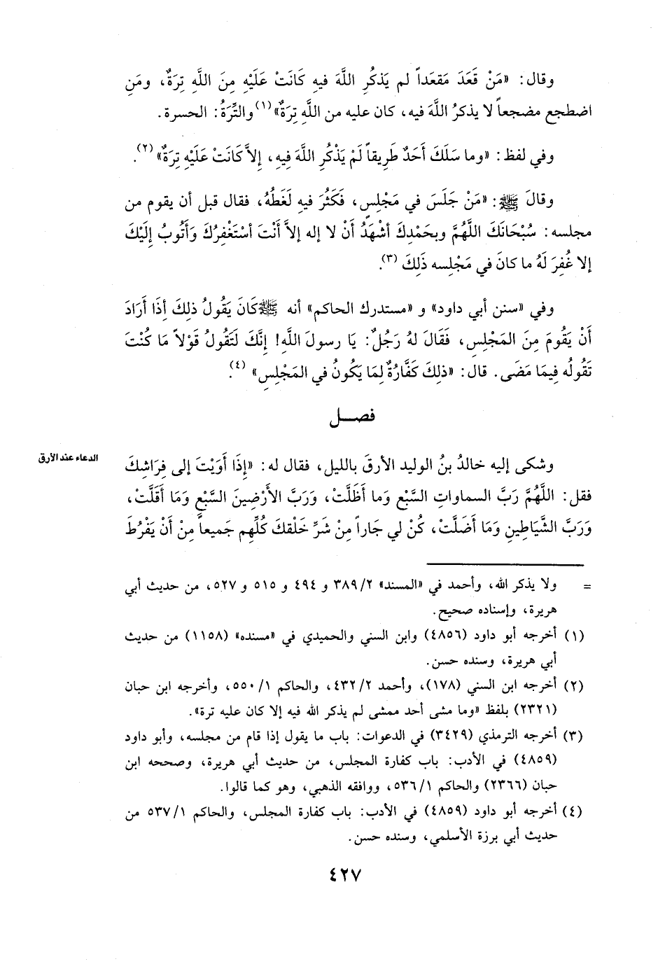 ( «وَشَكَا إِلَيْهِ خَالِدُ بْنُ الْوَلِيدِ الْأَرَقَ بِاللَّيْلِ فَقَالَ لَهُ: " إِذَا أَوَيْتَ إِلَى فِرَاشِكَ فَقُلِ: اللَّهُمَّ رَبَّ السَّمَاوَاتِ السَّبْعِ وَمَا أَظَلَّتْ، وَرَبَّ الْأَرَضِينَ السَّبْعِ وَمَا أَقَلَّتْ، وَرَبَّ الشَّيَاطِينِ وَمَا أَضَلَّتْ، كُنْ لِي جَارًا مِنْ شَرِّ خَلْقِكَ كُلِّهِمْ جَمِيعًا مِنْ أَنْ يَفْرُطَ