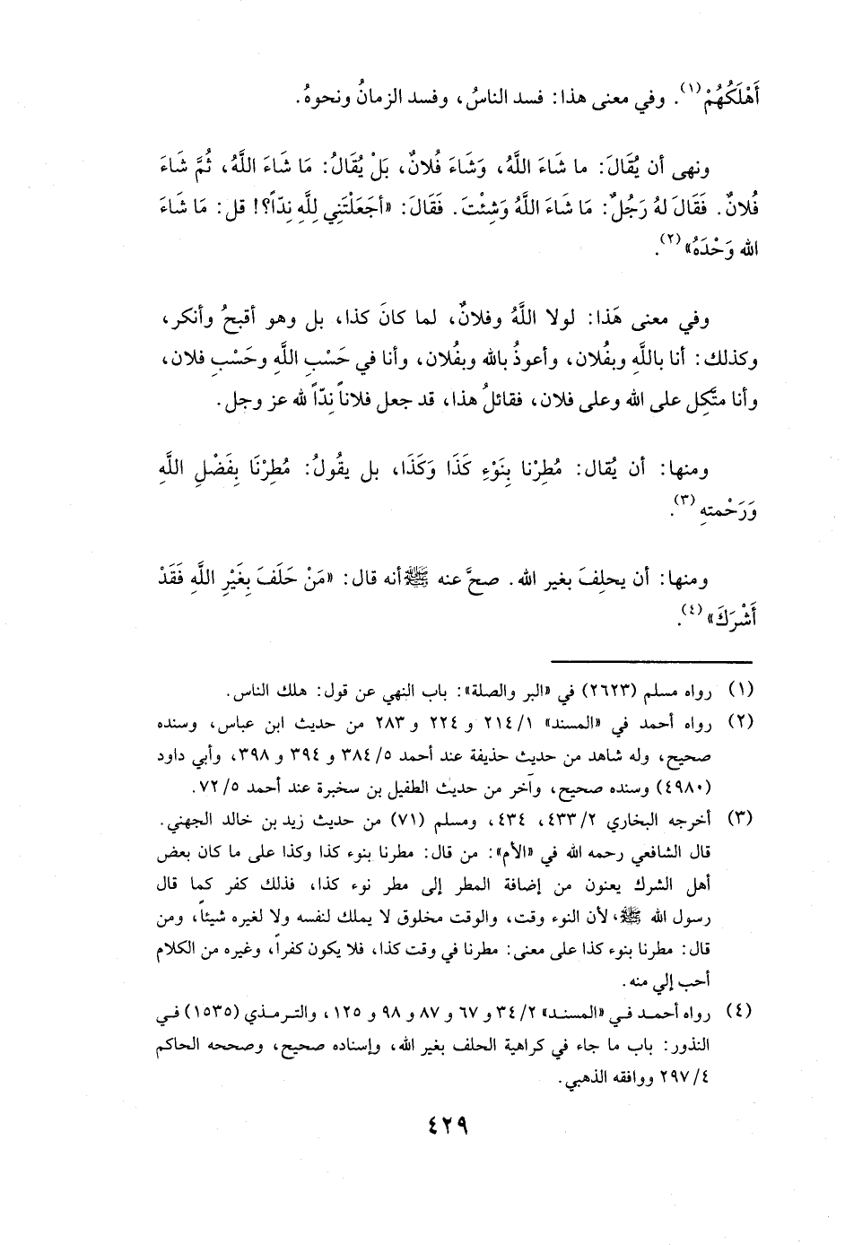 وَفِي مَعْنَى هَذَا: لَوْلَا اللَّهُ وَفُلَانٌ، لَمَا كَانَ كَذَا، بَلْ وَهُوَ أَقْبَحُ وَأَنْكَرُ، وَكَذَلِكَ: أَنَا بِاللَّهِ وَبِفُلَانٍ، وَأَعُوذُ بِاللَّهِ وَبِفُلَانٍ، وَأَنَا فِي حَسْبِ اللَّهِ وَحَسْبِ فُلَانٍ، وَأَنَا مُتَّكِلٌ عَلَى اللَّهِ وَعَلَى فُلَانٍ، فَقَائِلُ هَذَا، قَدْ جَعَلَ فُلَانًا نِدًّا لِلَّهِ عَزَّ وَجَلَّ.