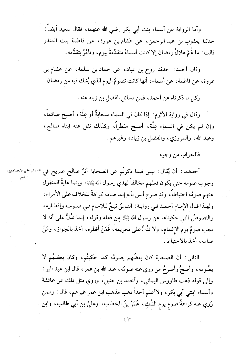 وَقَالَ أحمد: حَدَّثَنَا روح بن عباد، عَنْ حَمَّادِ بْنِ سَلَمَةَ، عَنْ هِشَامِ بْنِ عُرْوَةَ، عَنْ فاطمة، عَنْ أسماء أَنَّهَا كَانَتْ تَصُومُ الْيَوْمَ الَّذِي يُشَكُّ فِيهِ مِنْ رَمَضَانَ.