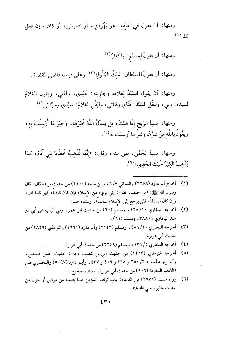 وَمِنْهَا: سَبُّ الرِّيحِ إِذَا هَبَّتْ، بَلْ يَسْأَلُ اللَّهَ خَيْرَهَا، وَخَيْرَ مَا أُرْسِلَتْ بِهِ، وَيَعُوذُ بِاللَّهِ مِنْ شَرِّهَا وَشَرِّ مَا أُرْسِلَتْ بِهِ.