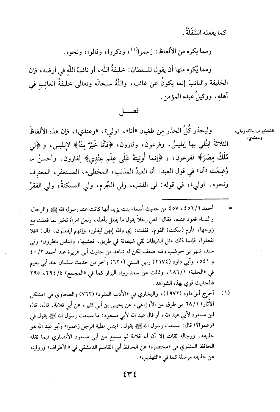 وَمِمَّا يُكْرَهُ مِنْهَا أَنْ يَقُولَ لِلسُّلْطَانِ: خَلِيفَةُ اللَّهِ أَوْ نَائِبُ اللَّهِ فِي أَرْضِهِ، فَإِنَّ الْخَلِيفَةَ وَالنَّائِبَ إِنَّمَا يَكُونُ عَنْ غَائِبٍ، وَاللَّهُ سُبْحَانَهُ وَتَعَالَى خَلِيفَةُ الْغَائِبِ فِي أَهْلِهِ، وَوَكِيلُ عَبْدِهِ الْمُؤْمِنِ.