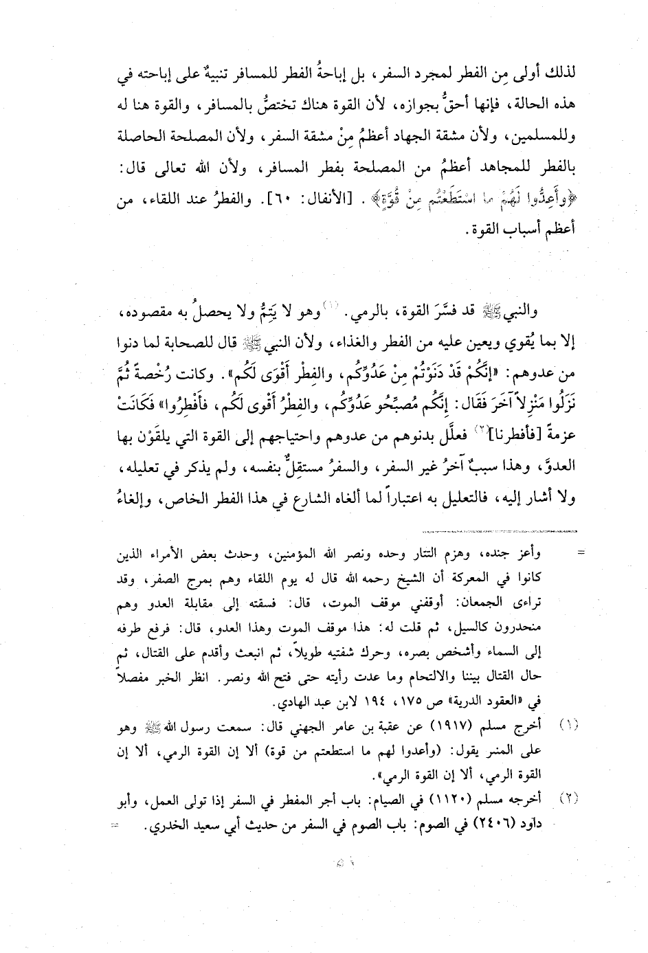 وَالنَّبِيُّ صَلَّى اللَّهُ عَلَيْهِ وَسَلَّمَ قَدْ فَسَّرَ الْقُوَّةَ بِالرَّمْيِ. وَهُوَ لَا يَتِمُّ وَلَا يَحْصُلُ بِهِ مَقْصُودُهُ إِلَّا بِمَا يُقَوِّي وَيُعِينُ عَلَيْهِ مِنَ الْفِطْرِ وَالْغِذَاءِ، وَلِأَنَّ النَّبِيَّ صَلَّى اللَّهُ عَلَيْهِ وَسَلَّمَ قَالَ لِلصَّحَابَةِ لَمَّا دَنَوْا مِنْ عَدُوِّهِمْ: ( «إِنَّكُمْ قَدْ دَنَوْتُمْ مِنْ عَدُوِّكُمْ، وَالْفِطْرُ أَقْوَى لَكُمْ» ) . وَكَانَتْ رُخْصَةً ثُمَّ نَزَلُوا مَنْزِلًا آخَرَ فَقَالَ: ( «إِنَّكُمْ مُصَبِّحُو عَدُوَّكُمْ، وَالْفِطْرُ أَقْوَى لَكُمْ فَأَفْطِرُوا» ) فَكَانَتْ عَزْمَةً [فَأَفْطَرْنَا] ، فَعَلَّلَ بِدُنُوِّهِمْ مِنْ عَدُوِّهِمْ وَاحْتِيَاجِهِمْ إِلَى الْقُوَّةِ الَّتِي يَلْقَوْنَ بِهَا الْعَدُوَّ، وَهَذَا سَبَبٌ آخَرُ غَيْرُ السَّفَرِ، وَالسَّفَرُ مُسْتَقِلٌّ بِنَفْسِهِ، وَلَمْ يَذْكُرْ فِي تَعْلِيلِهِ وَلَا أَشَارَ إِلَيْهِ، فَالتَّعْلِيلُ بِهِ اعْتِبَارًا لِمَا أَلْغَاهُ الشَّارِعُ فِي هَذَا الْفِطْرِ الْخَاصِّ، وَإِلْغَاءُ