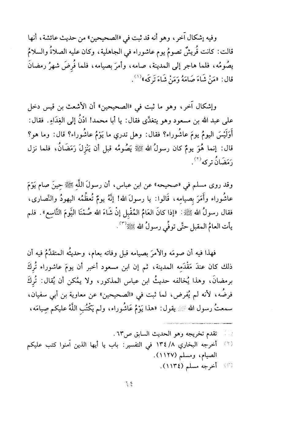 وَفِيهِ إِشْكَالٌ آخَرُ، وَهُوَ أَنَّهُ قَدْ ثَبَتَ فِي " الصَّحِيحَيْنِ " مِنْ حَدِيثِ عائشة أَنَّهَا قَالَتْ: ( «كَانَتْ قُرَيْشٌ تَصُومُ يَوْمَ عَاشُورَاءَ فِي الْجَاهِلِيَّةِ، وَكَانَ يَصُومُهُ، فَلَمَّا هَاجَرَ إِلَى الْمَدِينَةِ صَامَهُ وَأَمَرَ بِصِيَامِهِ، فَلَمَّا فُرِضَ شَهْرُ رَمَضَانَ قَالَ: مَنْ شَاءَ صَامَهُ وَمَنْ شَاءَ تَرَكَهُ» ) .