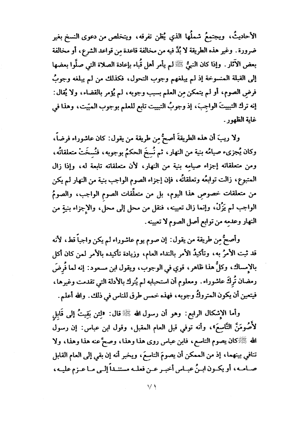 وَأَصَحُّ مِنْ طَرِيقَةِ مَنْ يَقُولُ: إِنَّ صَوْمَ يَوْمِ عَاشُورَاءَ لَمْ يَكُنْ وَاجِبًا قَطُّ؛ لِأَنَّهُ قَدْ ثَبَتَ الْأَمْرُ بِهِ، وَتَأْكِيدُ الْأَمْرِ بِالنِّدَاءِ الْعَامِّ، وَزِيَادَةُ تَأْكِيدِهِ بِالْأَمْرِ لِمَنْ كَانَ أَكَلَ بِالْإِمْسَاكِ، وَكُلُّ هَذَا ظَاهِرٌ، قَوِيٌّ فِي الْوُجُوبِ، وَيَقُولُ ابْنُ مَسْعُودٍ: إِنَّهُ ( «لَمَّا فُرِضَ رَمَضَانُ تُرِكَ عَاشُورَاءُ» ) .
