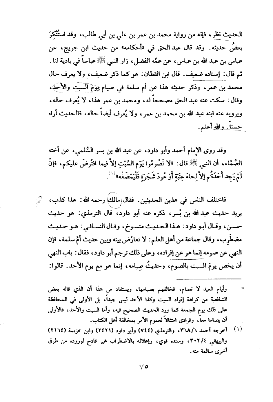 وَقَدْ رَوَى الْإِمَامُ أَحْمَدُ وأبو داود عَنْ عبد الله بن بسر السلمي، عَنْ أُخْتِهِ الصماء، أَنَّ النَّبِيَّ صَلَّى اللَّهُ عَلَيْهِ وَسَلَّمَ قَالَ: ( «لَا تَصُومُوا يَوْمَ السَّبْتِ إِلَّا فِيمَا افْتُرِضَ عَلَيْكُمْ فَإِنْ لَمْ يَجِدْ أَحَدُكُمْ إِلَّا لِحَاءَ عِنَبَةٍ أَوْ عُودَ شَجَرَةٍ فَلْيَمْضُغْهُ» ) .