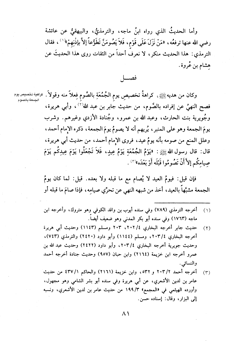 وَكَانَ مِنْ هَدْيِهِ صَلَّى اللَّهُ عَلَيْهِ وَسَلَّمَ كَرَاهَةُ تَخْصِيصِ يَوْمِ الْجُمُعَةِ بِالصَّوْمِ فِعْلًا مِنْهُ وَقَوْلًا. فَصَحَّ النَّهْيُ عَنْ إِفْرَادِهِ بِالصَّوْمِ، مِنْ حَدِيثِ جَابِرِ بْنِ عَبْدِ اللَّهِ، وَأَبِي هُرَيْرَةَ، وجويرية بنت الحارث، وعبد الله بن عمرو، وجنادة الأزدي وَغَيْرِهِمْ. وَشَرِبَ يَوْمَ الْجُمُعَةِ وَهُوَ عَلَى الْمِنْبَرِ، يُرِيهِمْ أَنَّهُ لَا يَصُومُ يَوْمَ الْجُمُعَةِ، ذَكَرَهُ الْإِمَامُ أَحْمَدُ، وَعَلَّلَ الْمَنْعَ مِنْ صَوْمِهِ بِأَنَّهُ يَوْمُ عِيدٍ، فَرَوَى الْإِمَامُ أَحْمَدُ مِنْ حَدِيثِ أَبِي هُرَيْرَةَ، قَالَ: قَالَ رَسُولُ اللَّهِ صَلَّى اللَّهُ عَلَيْهِ وَسَلَّمَ: ( «يَوْمُ الْجُمُعَةِ يَوْمُ عِيدٍ، فَلَا تَجْعَلُوا يَوْمَ عِيدِكُمْ يَوْمَ صِيَامِكُمْ إِلَّا أَنْ تَصُومُوا قَبْلَهُ أَوْ بَعْدَهُ» ) .