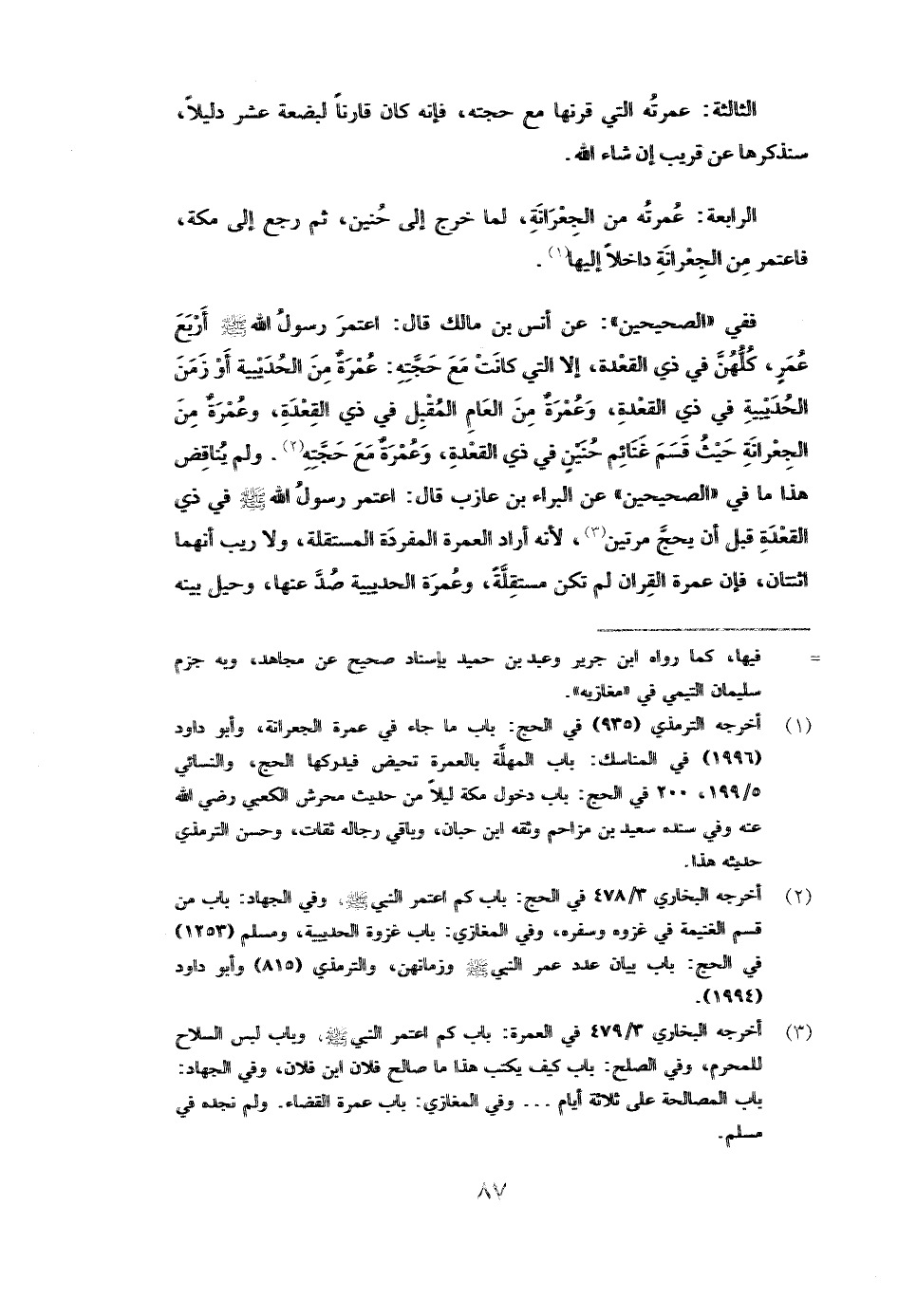 فَفِي " الصَّحِيحَيْنِ ": عَنْ أَنَسِ بْنِ مَالِكٍ قَالَ: ( «اعْتَمَرَ رَسُولُ اللَّهِ صَلَّى اللَّهُ عَلَيْهِ وَسَلَّمَ أَرْبَعَ عُمَرٍ، كُلُّهُنَّ فِي ذِي الْقَعْدَةِ، إِلَّا الَّتِي كَانَتْ مَعَ حَجَّتِهِ: عُمْرَةٌ مِنَ الْحُدَيْبِيَةِ أَوْ زَمَنَ الْحُدَيْبِيَةِ فِي ذِي الْقَعْدَةِ، وَعُمْرَةٌ مِنَ الْعَامِ الْمُقْبِلِ فِي ذِي الْقَعْدَةِ، وَعُمْرَةٌ مِنَ الْجِعْرَانَةِ حَيْثُ قَسَّمَ غَنَائِمَ حُنَيْنٍ فِي ذِي الْقَعْدَةِ، وَعُمْرَةٌ مَعَ حَجَّتِهِ» ) .