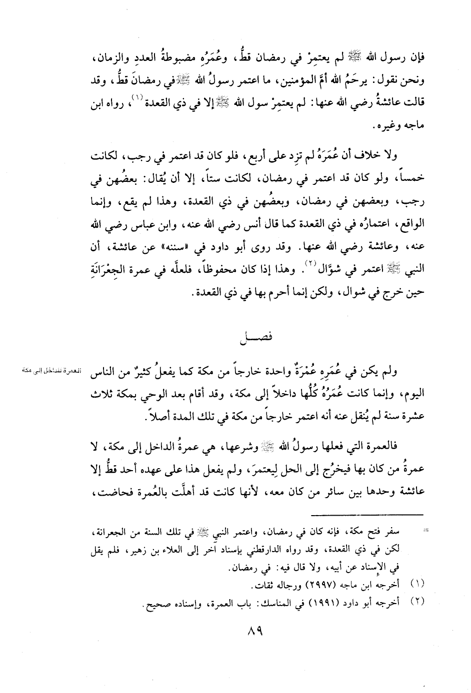 فَإِنَّ رَسُولَ اللَّهِ صَلَّى اللَّهُ عَلَيْهِ وَسَلَّمَ لَمْ يَعْتَمِرْ فِي رَمَضَانَ قَطُّ، وَعُمَرُهُ مَضْبُوطَةُ الْعَدَدِ وَالزَّمَانِ، وَنَحْنُ نَقُولُ: يَرْحَمُ اللَّهُ أُمَّ الْمُؤْمِنِينَ، مَا اعْتَمَرَ رَسُولُ اللَّهِ صَلَّى اللَّهُ عَلَيْهِ وَسَلَّمَ فِي رَمَضَانَ قَطُّ، وَقَدْ قَالَتْ عائشة رَضِيَ اللَّهُ عَنْهَا: «لَمْ يَعْتَمِرْ رَسُولُ اللَّهِ صَلَّى اللَّهُ عَلَيْهِ وَسَلَّمَ إِلَّا فِي ذِي الْقَعْدَةِ» ، رَوَاهُ ابْنُ مَاجَهْ وَغَيْرُهُ.