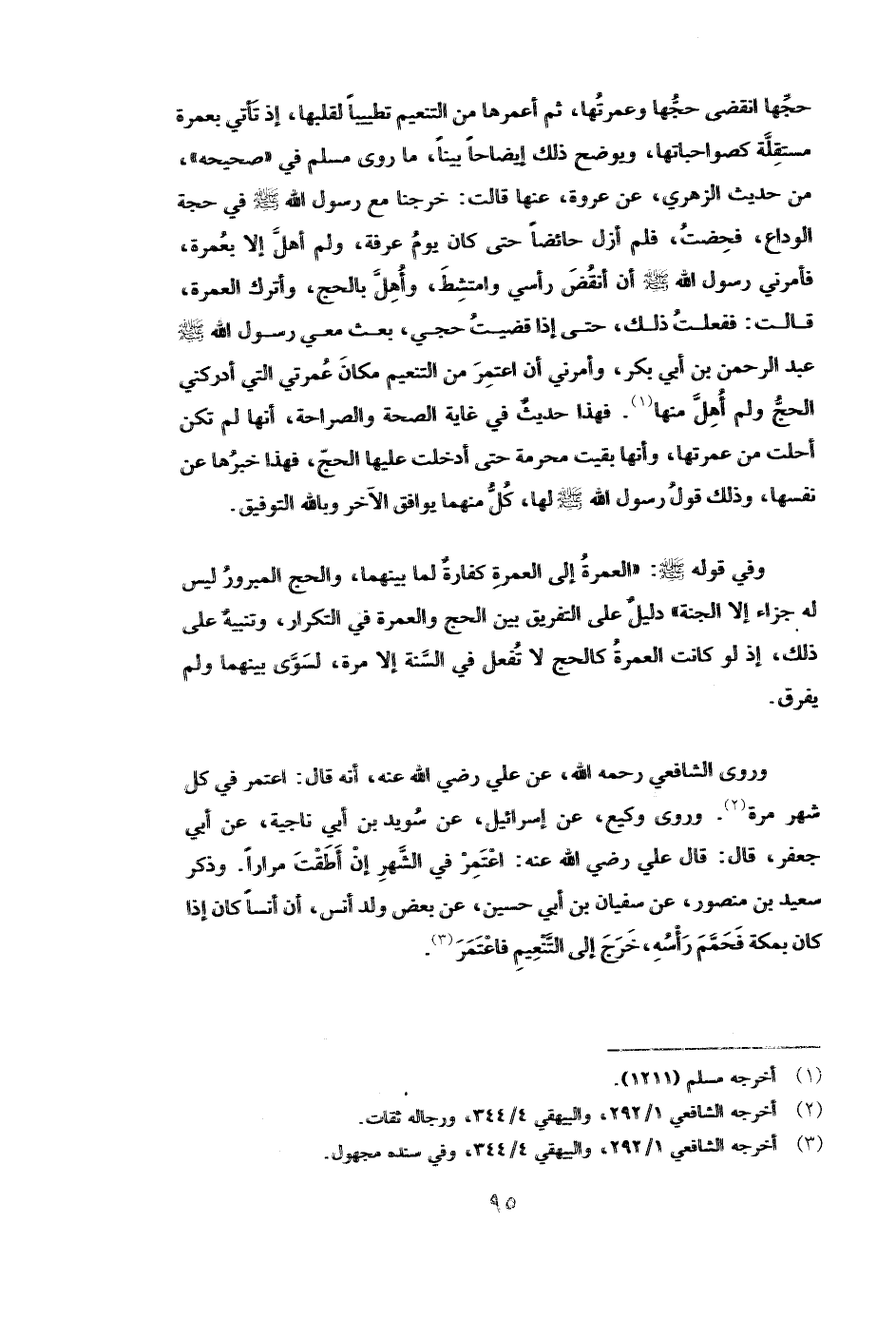 وَرَوَى الشَّافِعِيُّ رَحِمَهُ اللَّهُ، (عَنْ علي رَضِيَ اللَّهُ عَنْهُ، أَنَّهُ قَالَ: اعْتَمِرْ فِي كُلِّ شَهْرٍ مَرَّةً) وَرَوَى وَكِيعٌ، عَنْ إسرائيل عَنْ سويد بن أبي ناجية، عَنْ أبي جعفر قَالَ، (قَالَ علي رَضِيَ اللَّهُ عَنْهُ: اعْتَمِرْ فِي الشَّهْرِ إِنْ أَطَقْتَ مِرَارًا) وَذَكَرَ سَعِيدُ بْنُ مَنْصُورٍ، عَنْ سفيان بن أبي حسين، عَنْ بَعْضِ وَلَدِ أنس، (أَنَّ أنسا كَانَ إِذَا كَانَ بِمَكَّةَ فَحَمَّمَ رَأْسَهُ، خَرَجَ إِلَى التَّنْعِيمِ فَاعْتَمَرَ) .