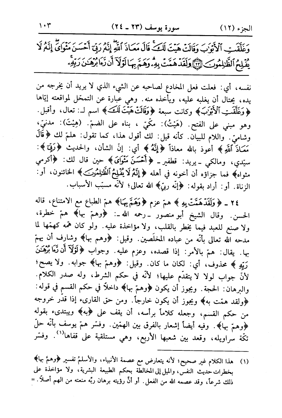 وَلَقَدْ هَمَّتْ بِهِ وَهَمَّ بِهَا لَوْلَا أَنْ رَأَى بُرْهَانَ رَبِّهِ كَذَلِكَ لِنَصْرِفَ عَنْهُ السُّوءَ وَالْفَحْشَاءَ إِنَّهُ مِنْ عِبَادِنَا الْمُخْلَصِينَ (24)