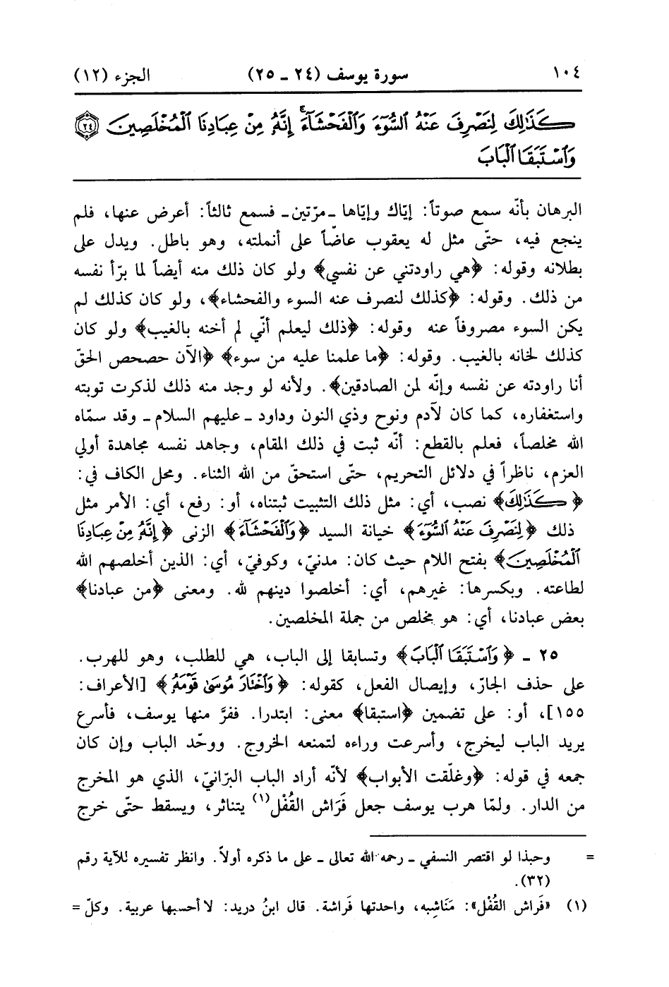 البرهان بأنه سمع صوتاً إياك وإياها مرتين فسمع ثالثاً أعرض عنها فلم ينجع فيه حتى مثل له يعقوب عاضاً على أنملته وهو باطل ويدل على بطلانه قوله هى راودتنى عن نفسي ولو كان ذلك منه أيضاً لما برأ نفسه من ذلك وقوله كذلك لنصرف عنه السوء والفحشاء ولو كان كذلك لم يكن السوء مصروفاً عنه وقوله ذلك ليعلم أني لم أخنه بالغيب ولو كان كذلك لخانه بالغيب وقوله مَا عَلِمْنَا عَلَيْهِ من سوء الآن حصحص الحق أنا راودته عن نفسه وإنه لمن الصادقين ولأنه لو وجد منا ذلك لذكرت توبته واستغفاره كما كان لآدم ونوح وذي النون وداود عليهم السلام وقد سماه الله مخلصاً فعلم بالقطع أنه ثبت في ذلك المقام وجاهد نفسه مجاهدة أولي العزم ناظر في دلائل التحريم حتى استحق من الله الثناء ومحل الكاف في {كذلك} نصب أي مثل ذلك التثبيت ثبتناه أو رفع أي الأمر مثل ذلك {لِنَصْرِفَ عَنْهُ السوء} خيانة السيد {والفحشاء} الزنا {إِنَّهُ مِنْ عِبَادِنَا المخلصين} بفتح اللام حيث كان مدني وكوفي أي الذين أخلصهم الله لطاعته وبكسرها غيرهم أي الذين أخلصوا دينهم لله ومعنى من عبادنا بعض عبادنا أى هو مخلص من جملة المخلصين